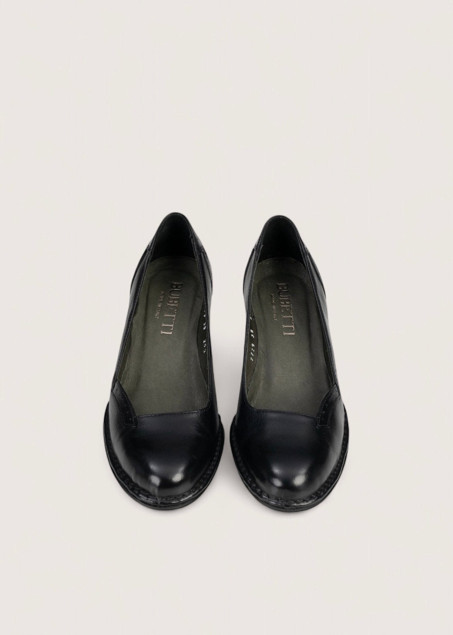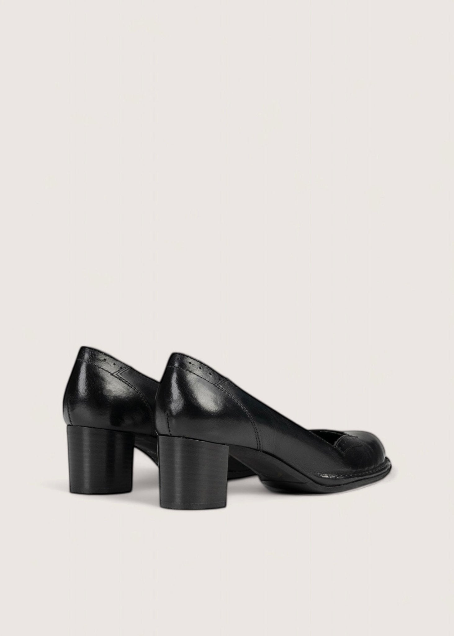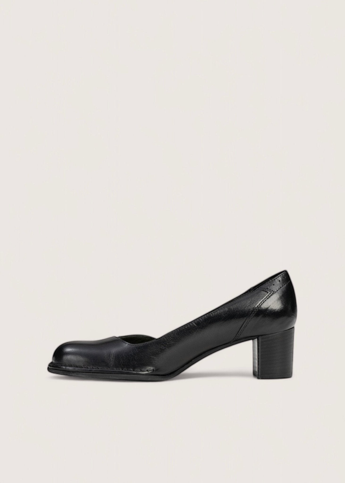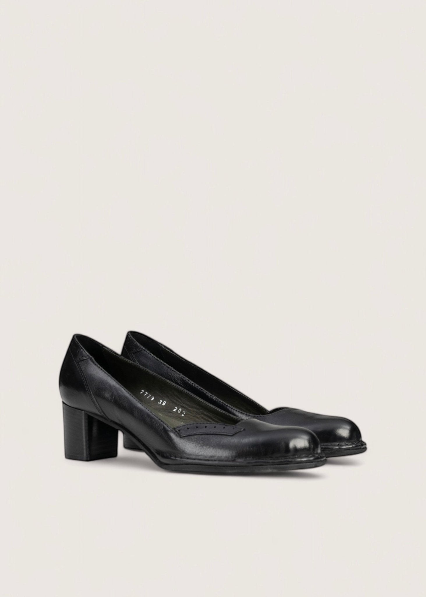 Klassisk, sort pumps med lille hæl på 5 cm. Skoen er lavet i lækkert vegetabilsk garvet skind og har skindsåler belagt med gummi.