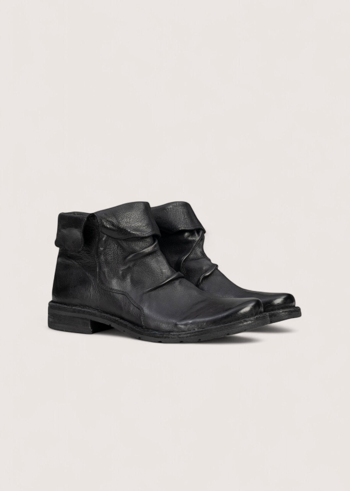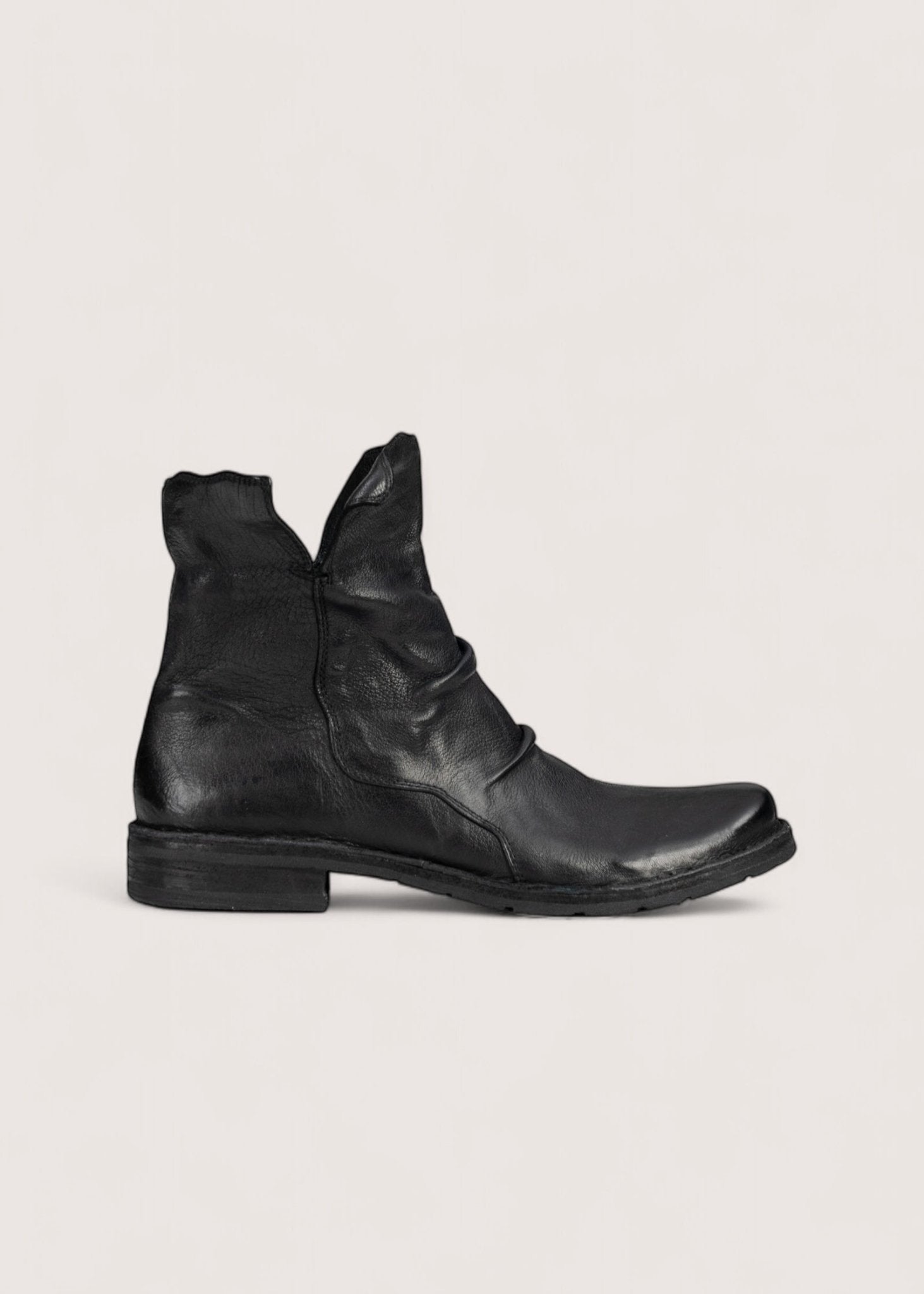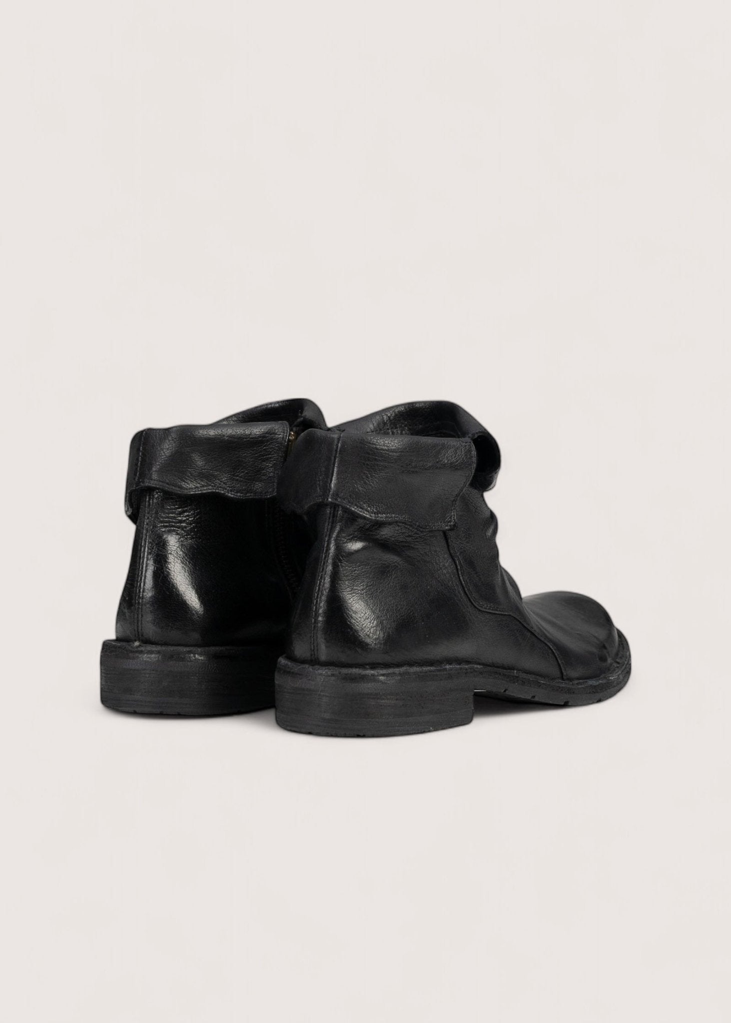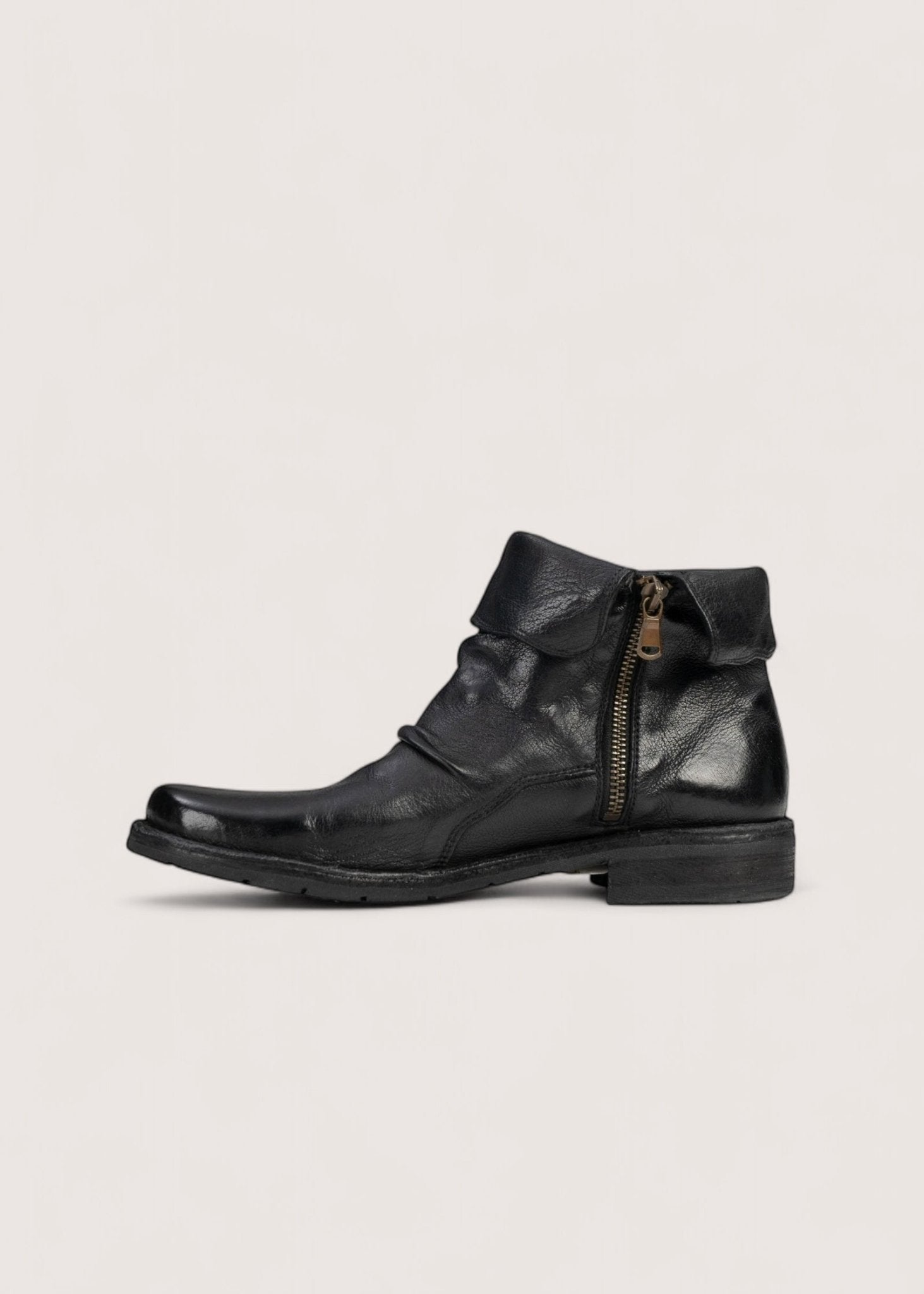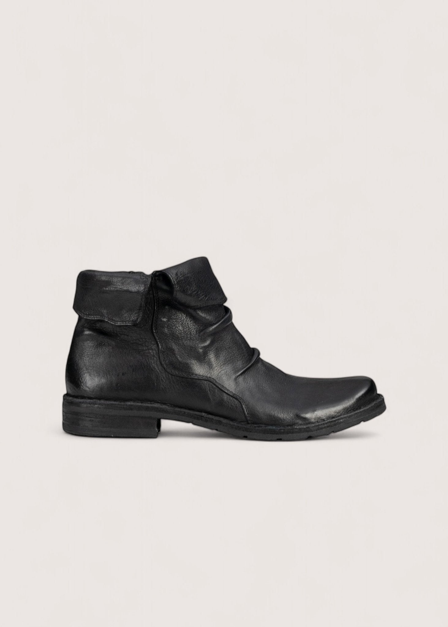 Flot, sort støvle lavet i vasket, vegetabilsk garvet skind, der er dejligt blødt og meget slidstærkt. Støvlen har indvendig lynlås og en kant, der kan foldes op og ned samt skindsål betrukket med gummi.