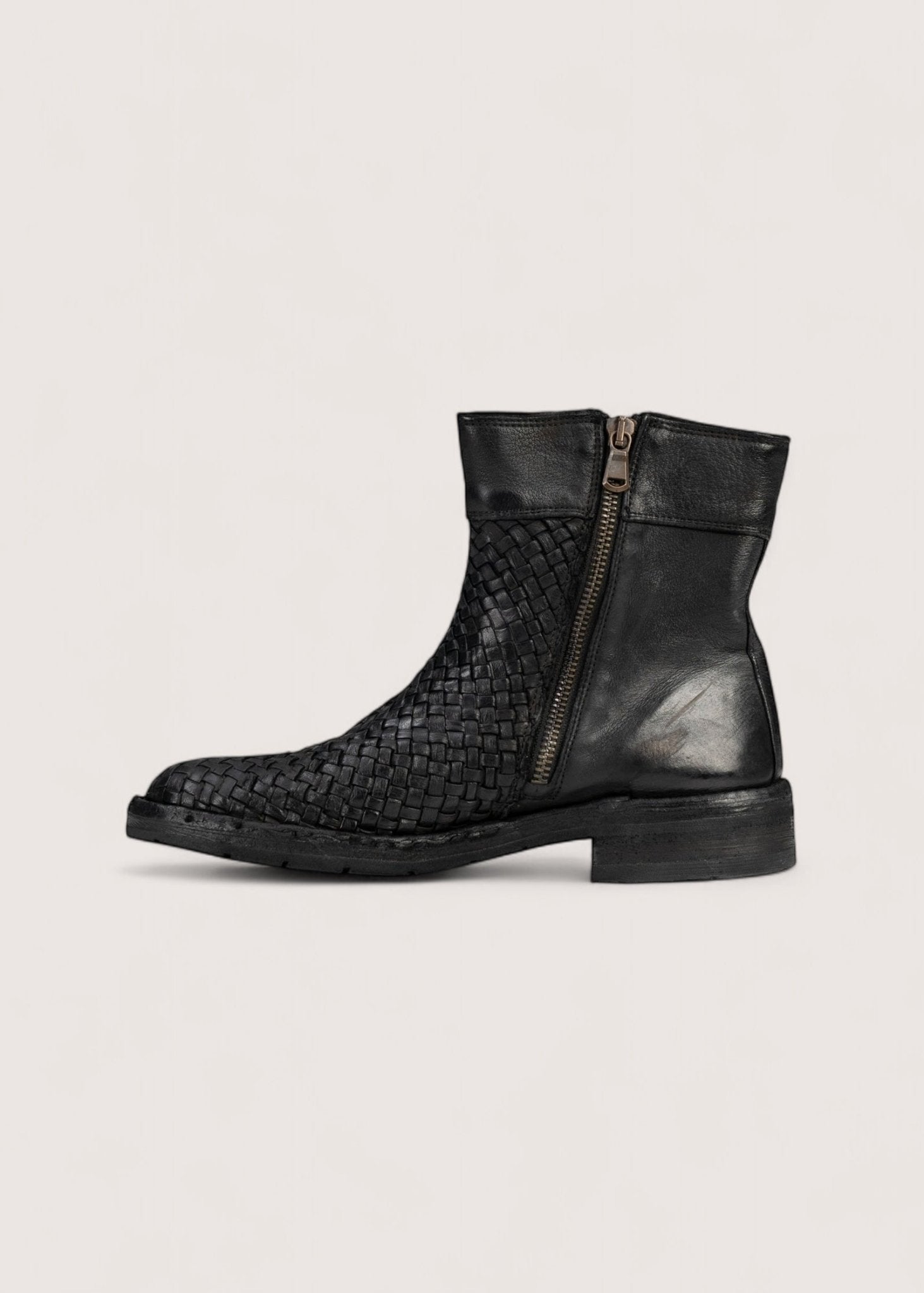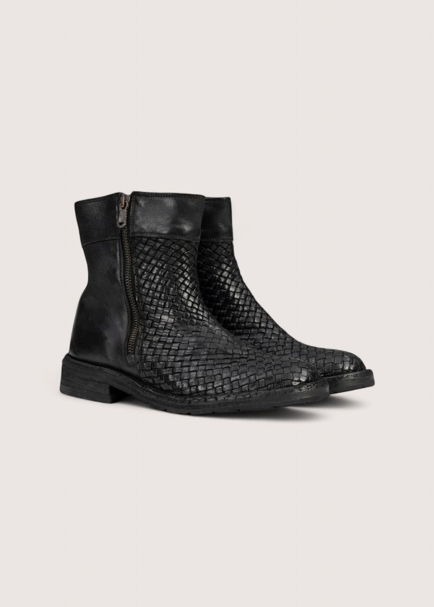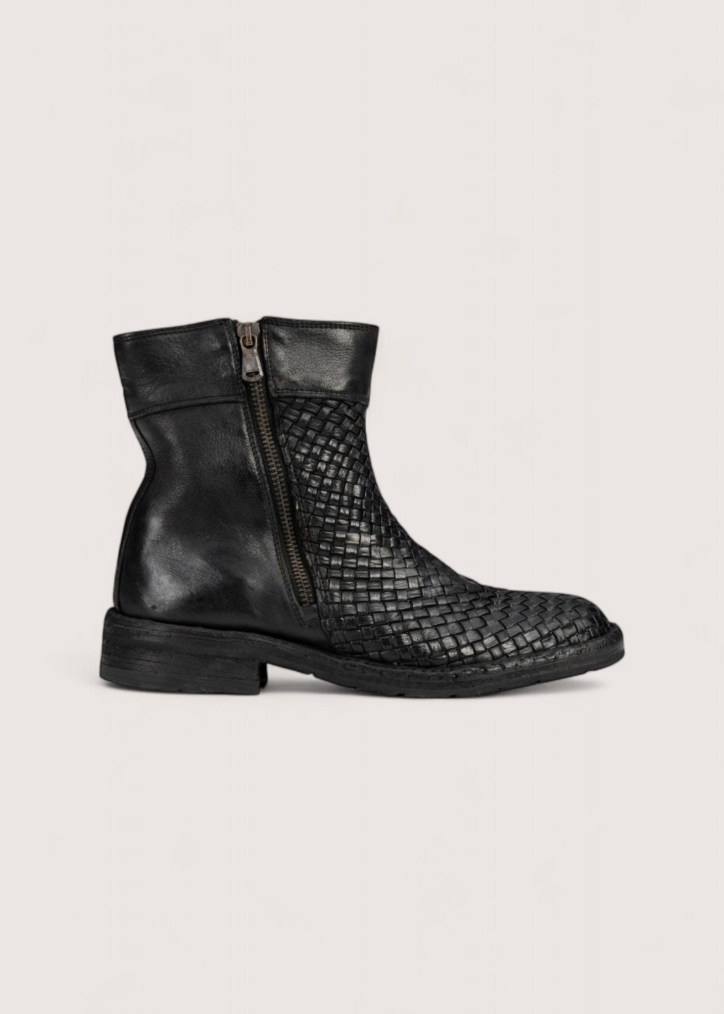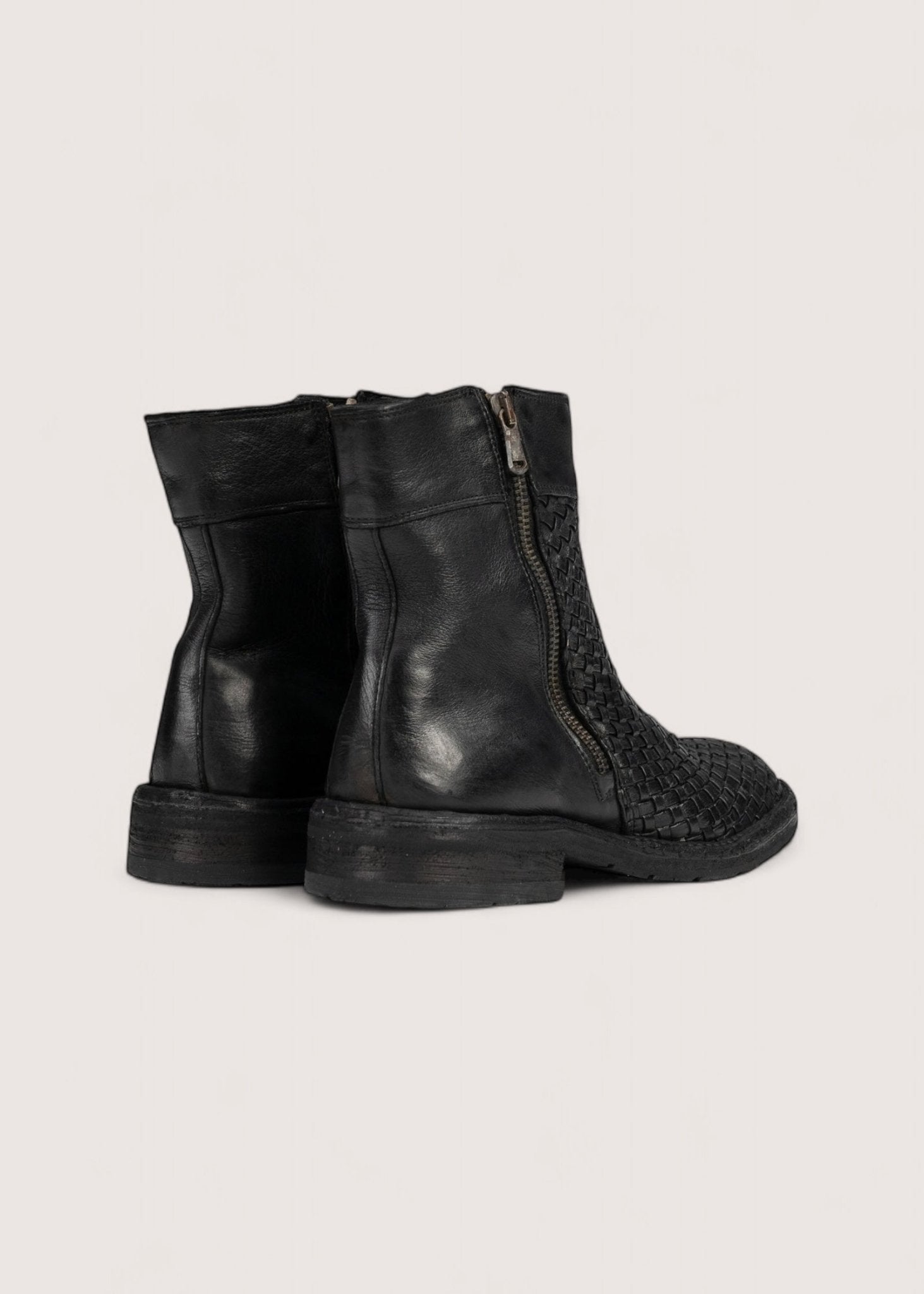 Bubetti støvlet art. 6912 i sort vasket vegetabilsk garvet skind med flet og dobbelt lynlås samt lædersåler betrukket med sort gummisål. Fås i farvene sort og cognac.