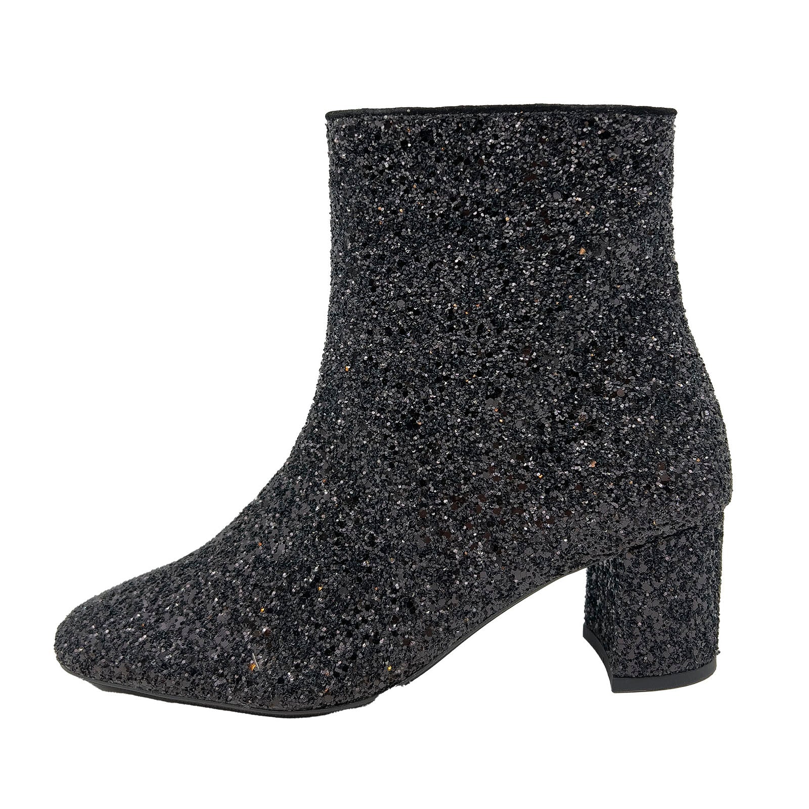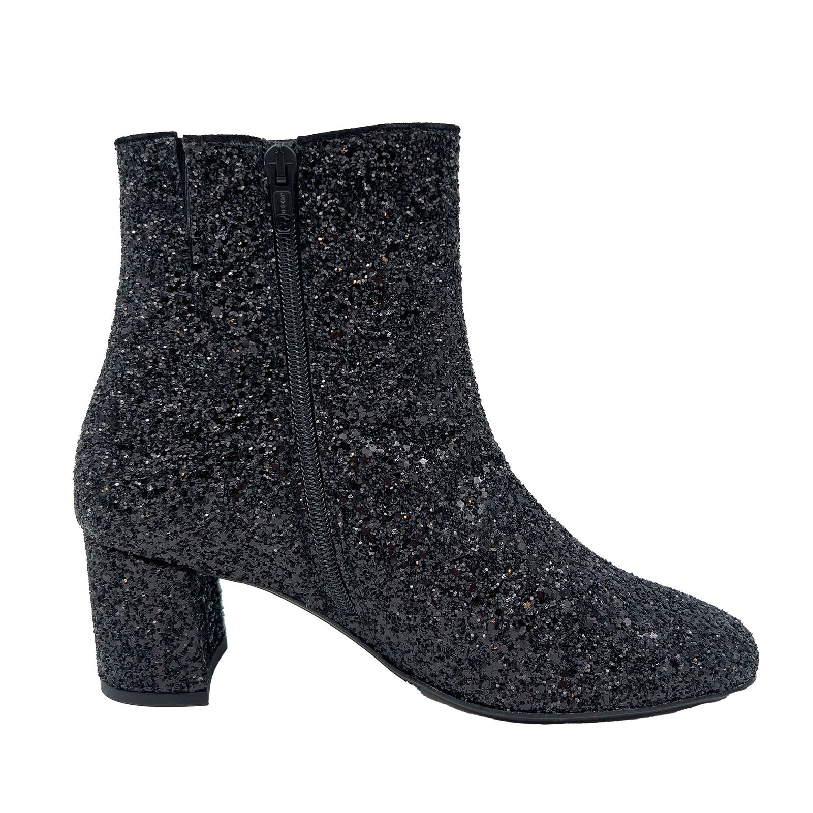 Funklende sort glitterstøvlet med 6 cm blokhæl, som er en videreudvikling af en elsket klassiker. Støvletten har en mandelformet snude, lynlås i den ene side, polstret indersål og er udformet i naturligt og åndbart skind. Designet i Danmark og håndlavet med kærlighed i Portugal. Skoen skal ikke have imprægnering eller andet pleje, da det kan gøre glitteret mat.