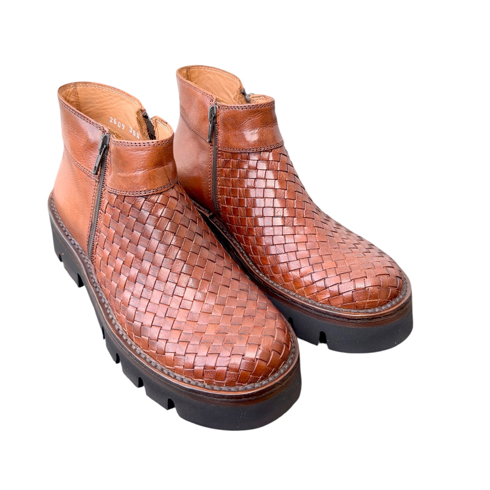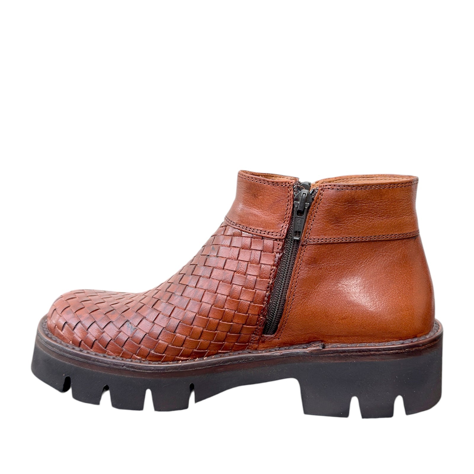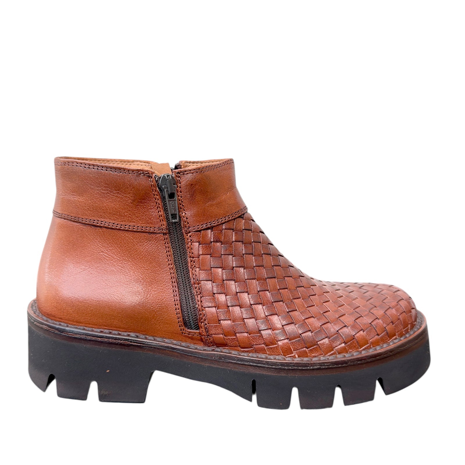 En klassiske! kort, cognac farvet støvle lavet i vegetabilsk garvet kalveskind skind. Støvlen har flet fortil og dobbelt lynlås samt letvægtssål.