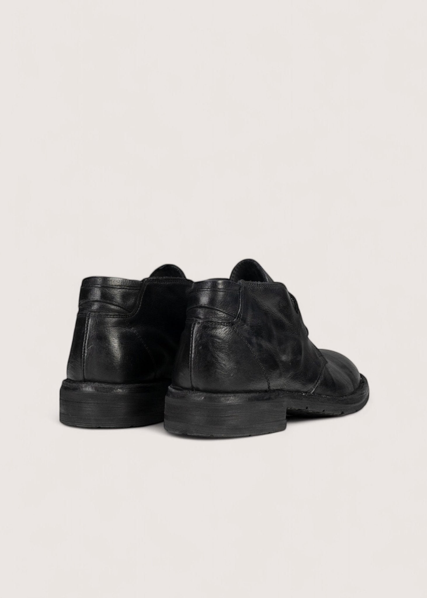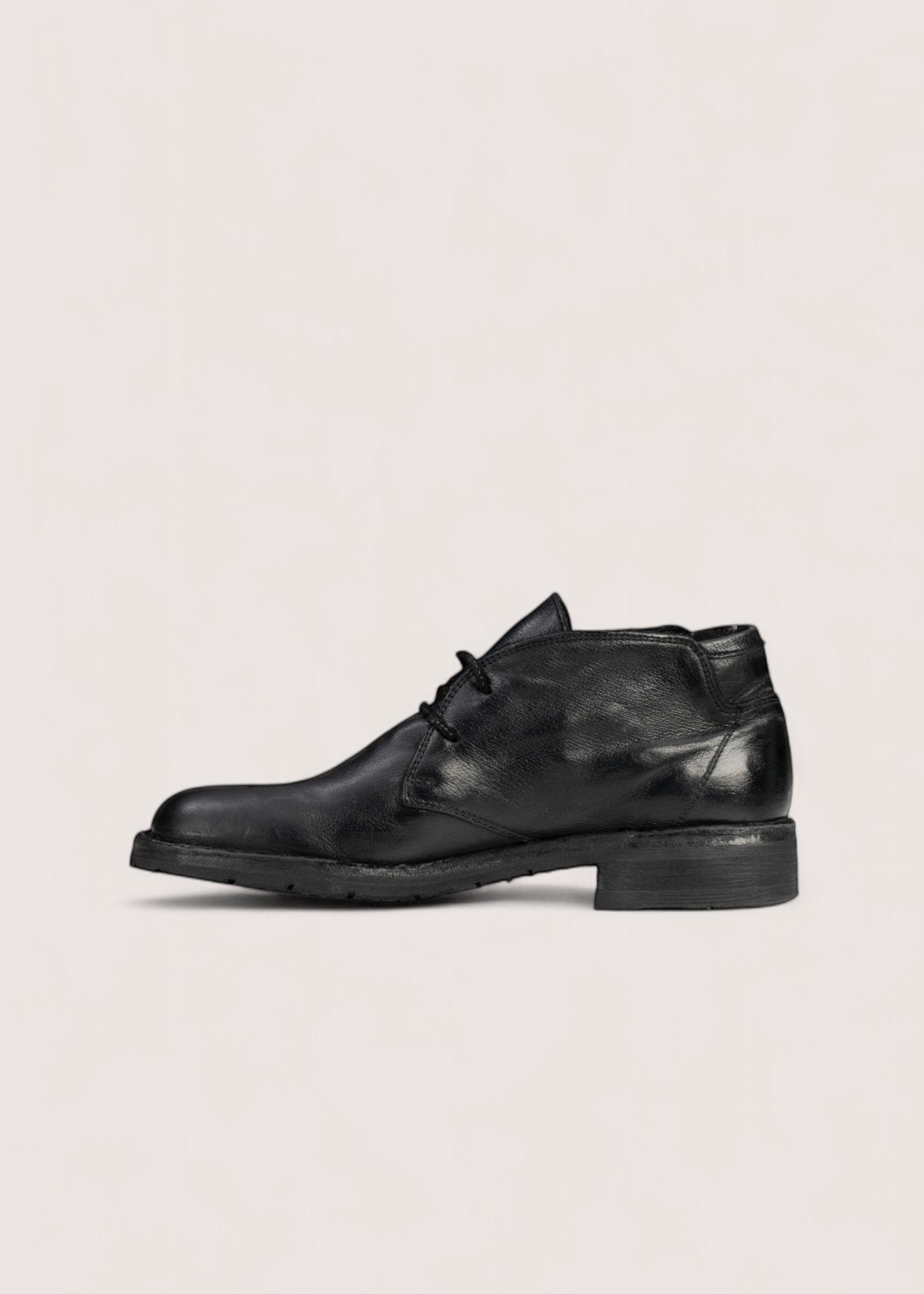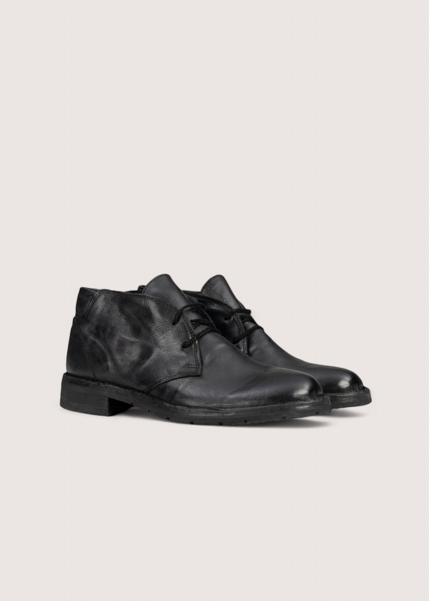 Kort snørestøvle lavet i hele stykker vasket vegetabilsk garvet skind, der gør støvlen usædvanlig slidstærk. Støvlen bindes med snøre og har skindsåler betrukket med gummi.