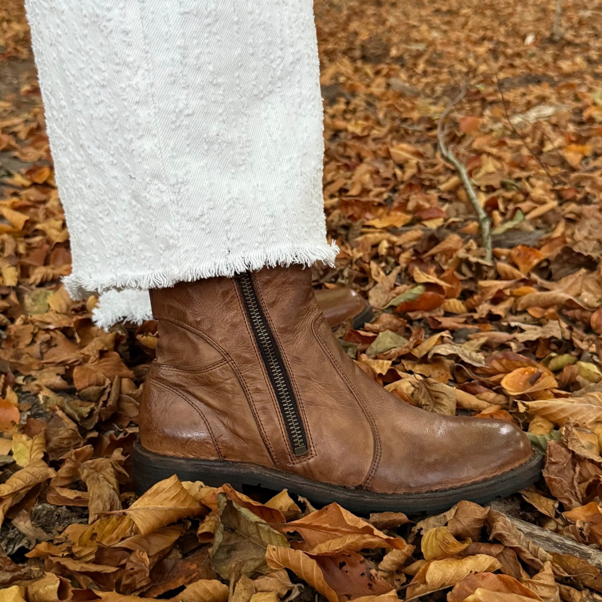 Lækker damestøvle i en flot lys, brun lavet i hele stykker vasket, vegetabilsk garvet kalveskind, der gør støvlen usædvanlig slidstærk og giver den patina fra start. Støvlen har skjult pløs og to lynlåse samt skindsåler betrukket med en solid gummisål. Skindets rå og unikke look opnås igennem en helt speciel vaskeproces - således kan hvert stykke fodtøj variere i skindet.
