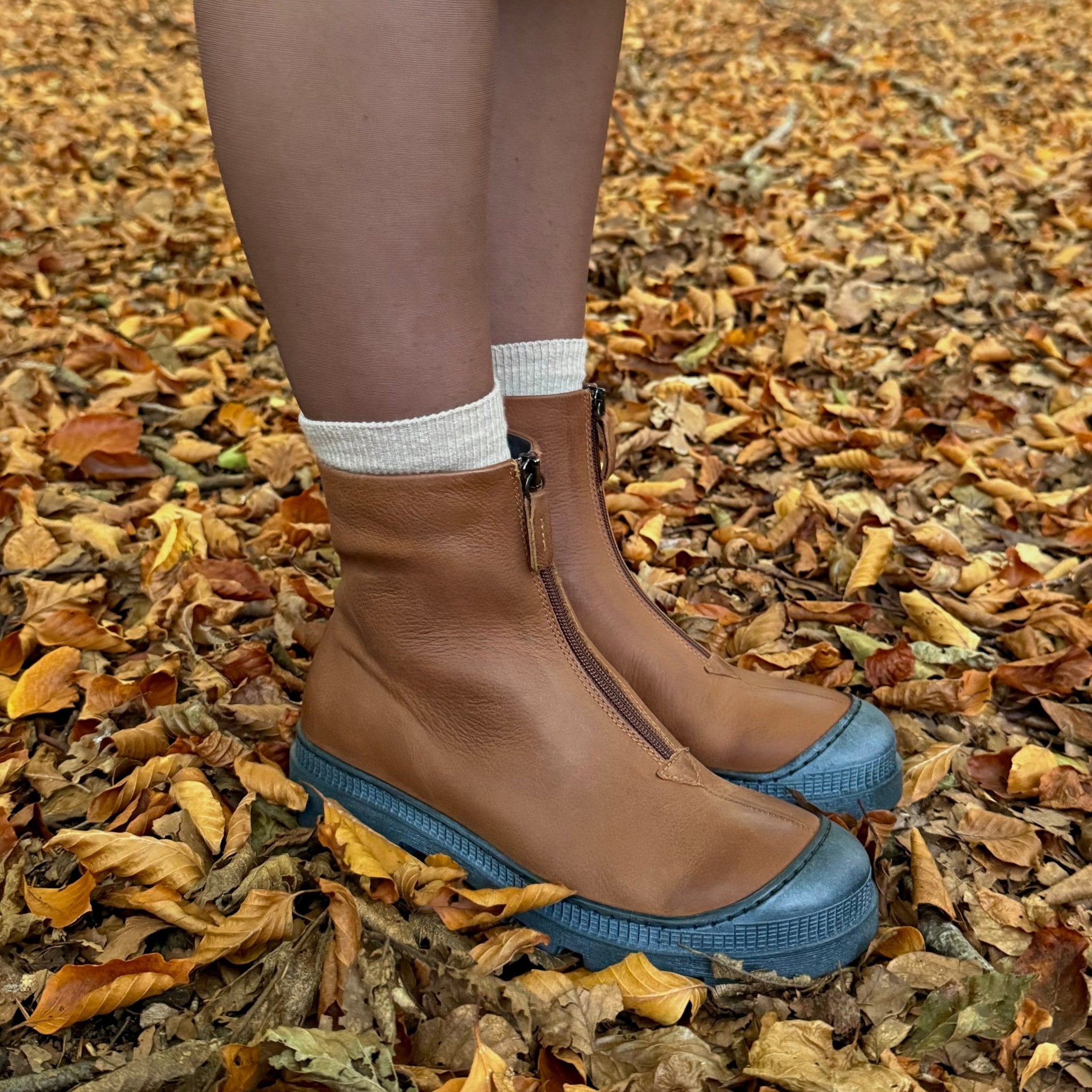 Klassisk Lofina damestøvle i en flot cognac, lavet i lækkert kalveskind, der har fået en olieret overfladebehandling, hvilket giver støvlen et rå look. Støvlen har lynlås ned over vristen og en pyntestrop bagtil. Stroppen er ikke til praktisk brug. Lavet på en kraftig gummisål, der er yderst slidstærk og perfekt til de lidt køligere grader.