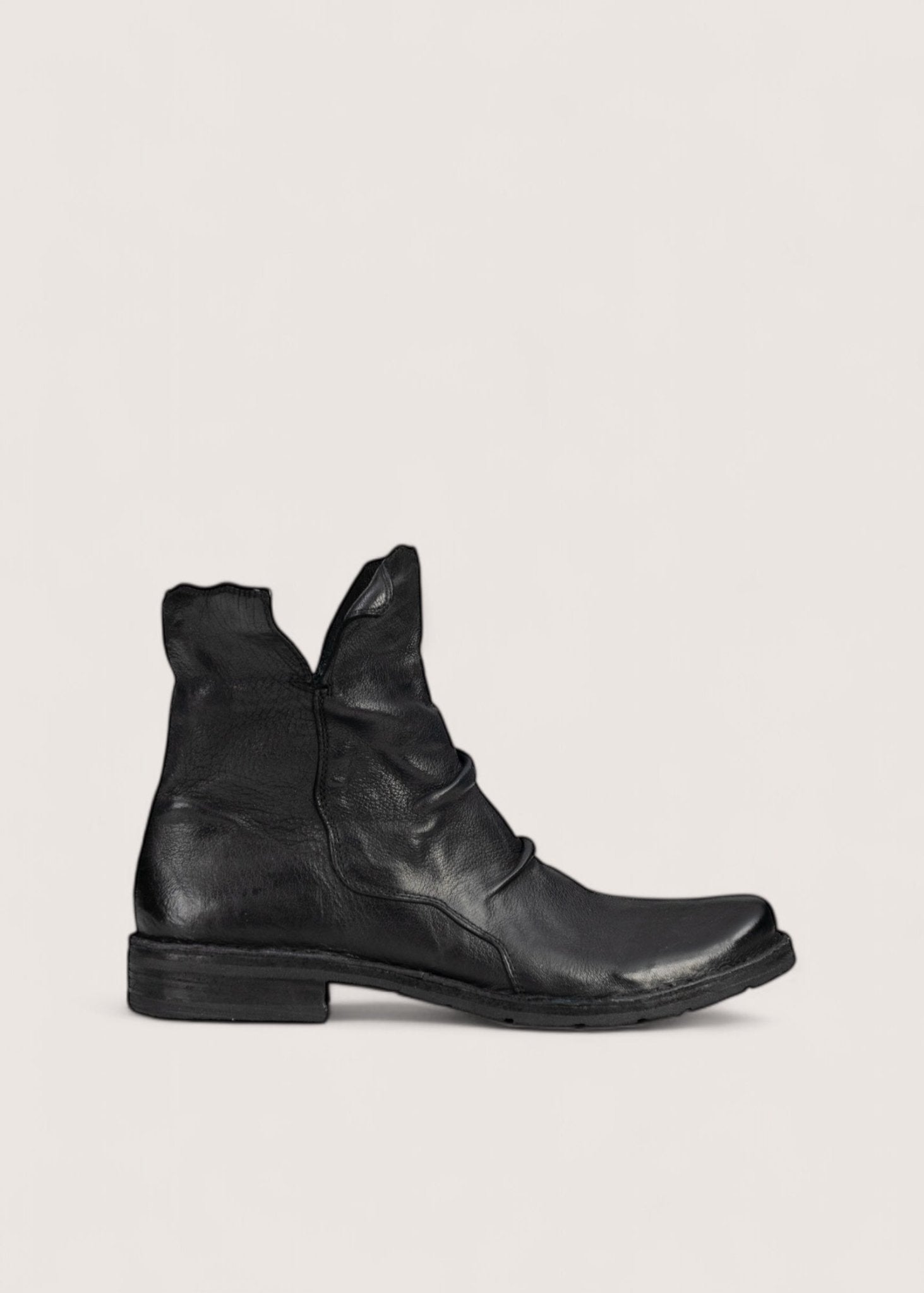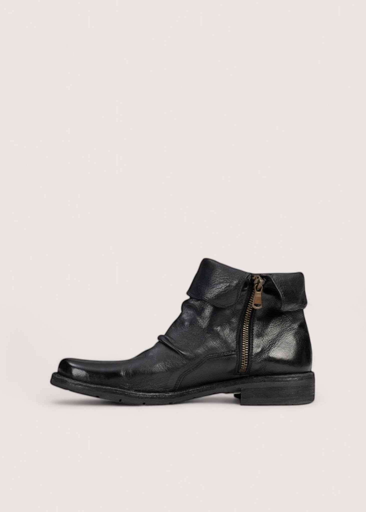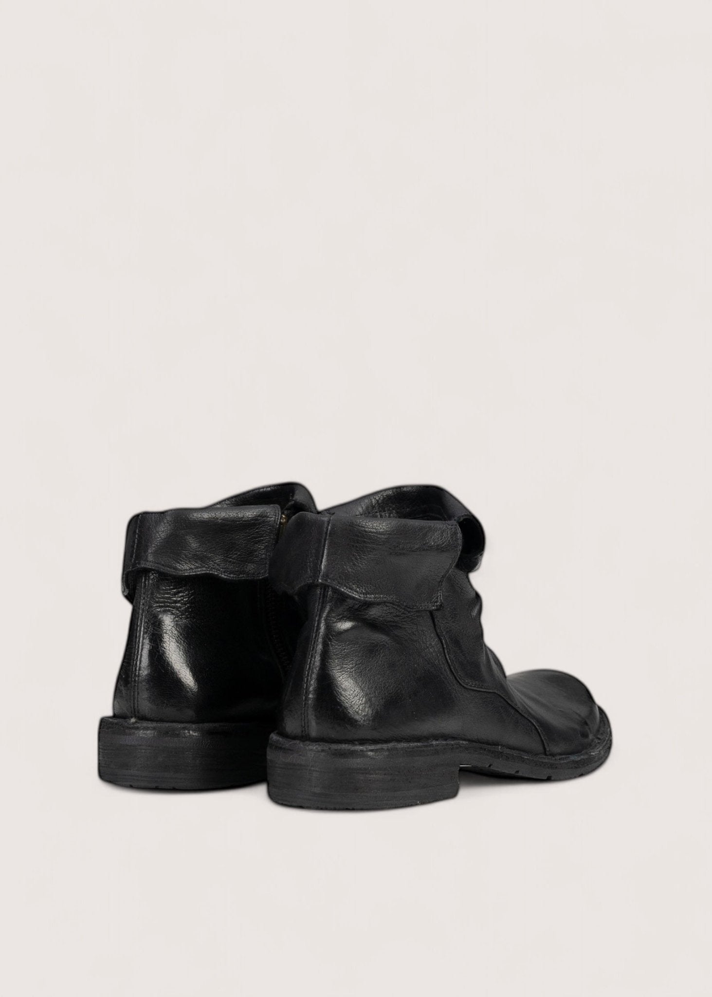 Flot, sort støvle lavet i vasket, vegetabilsk garvet skind, der er dejligt blødt og meget slidstærkt. Støvlen har indvendig lynlås og en kant, der kan foldes op og ned samt skindsål betrukket med gummi.