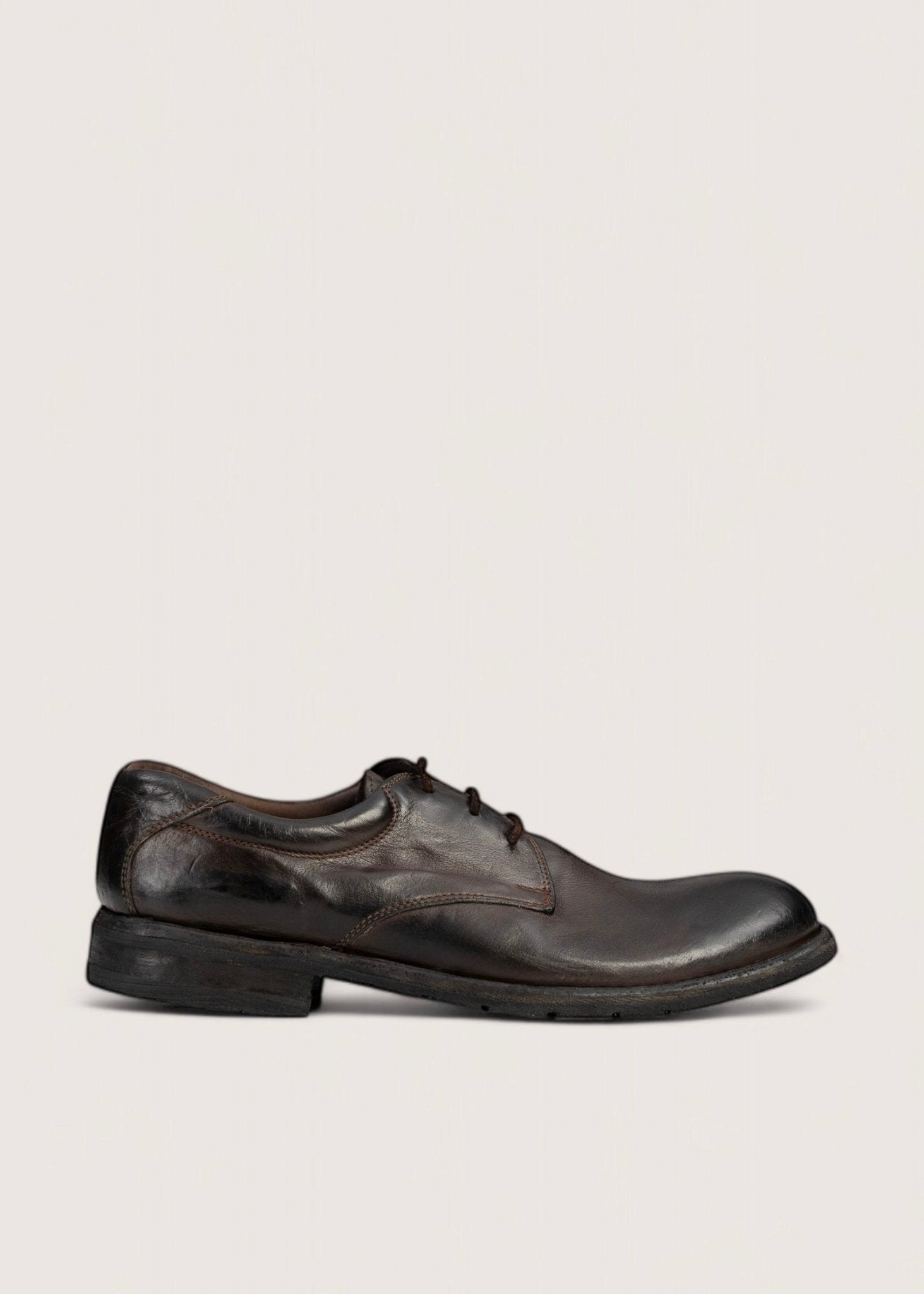 Herre snøresko i mørkebrun lavet i lækkert vegetabilsk garvet kalveskind. Skoen har rund snude, tre snørehuller samt ruskindssnøre og skindsål betrukket med slidstærkt gummi. Skindets rå og patinerede look opnås gennem en helt speciel vaskeproces.