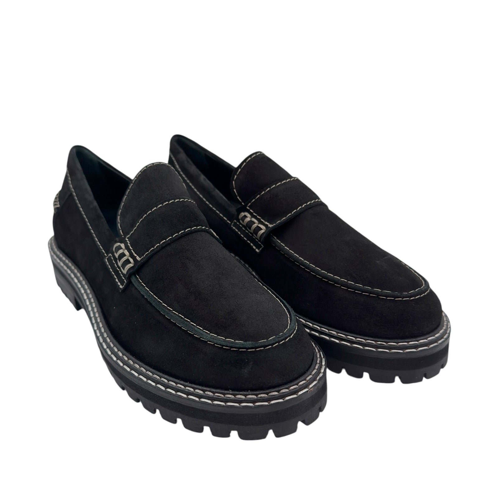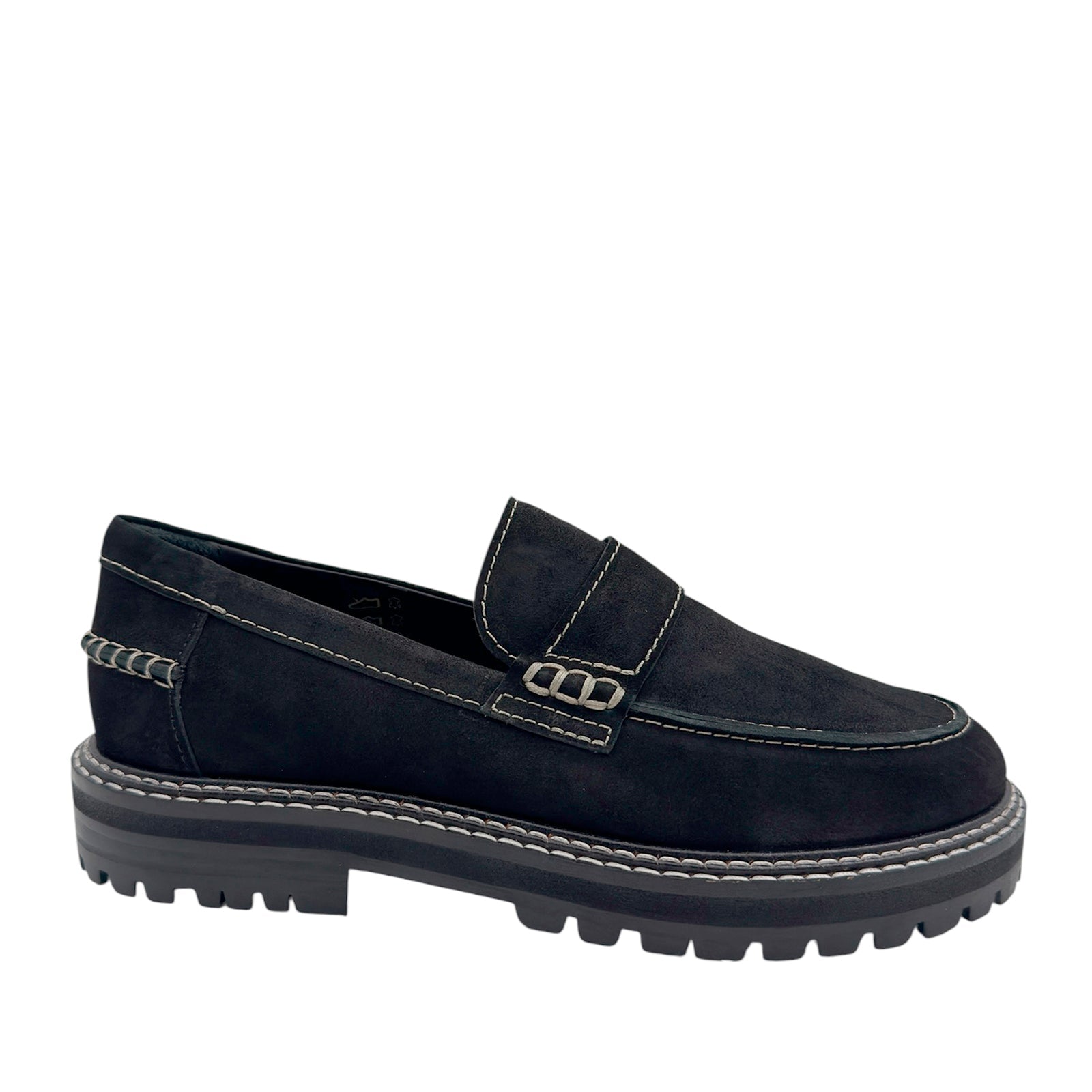 Chunky Penny loafer, sort ruskind, med dekorative kontraststikninger. Loaferen har en rundet snude, vatteret indersål, kromfrit læderfoer og en sort gummi tracksål. Udformet i naturligt og åndbart skind. Designet i Danmark og håndlavet med kærlighed i Portugal.