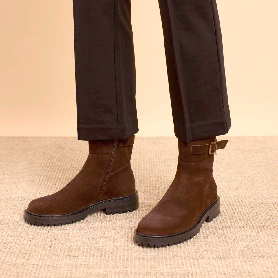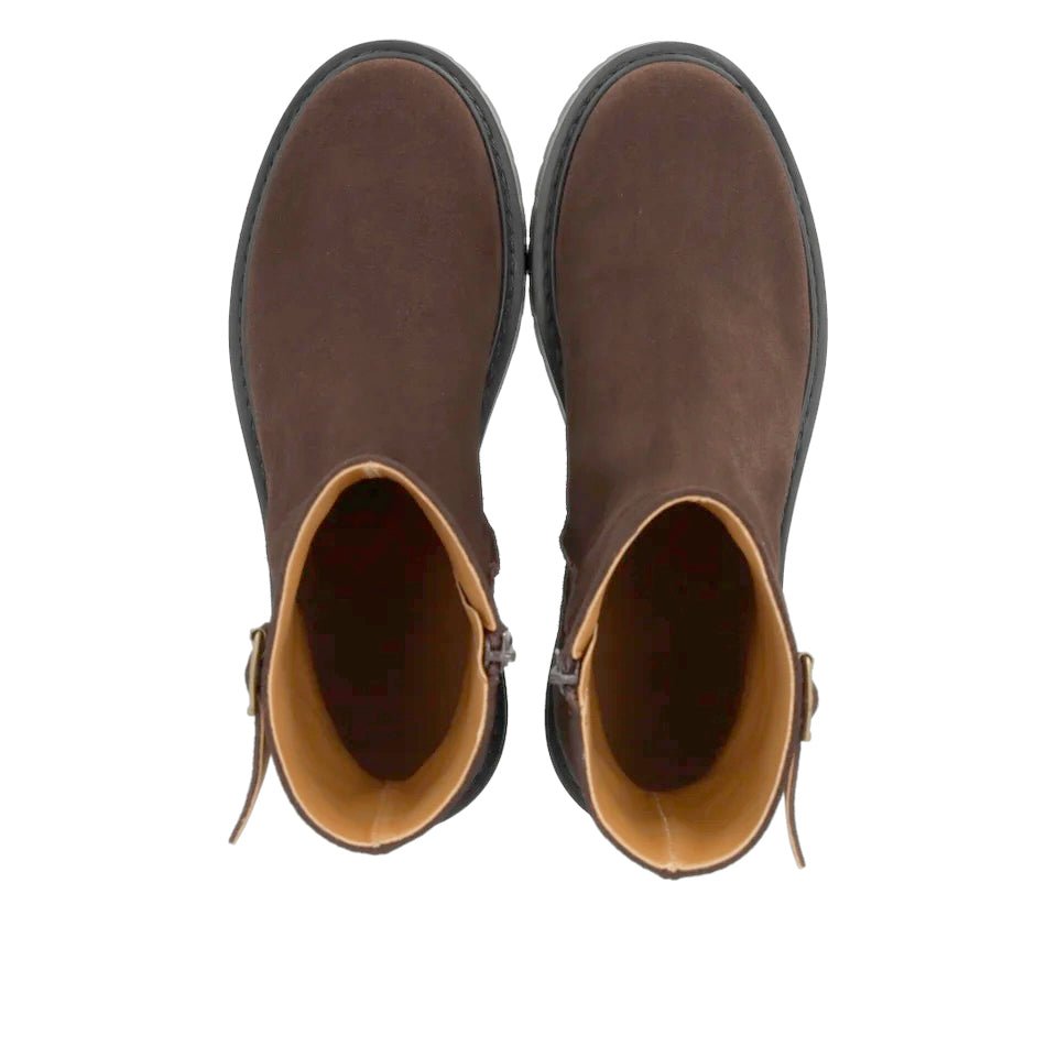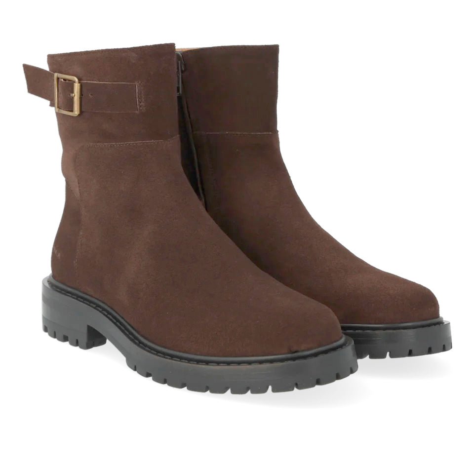 Støvle i skind med dekorativ spændedetalje. Støvlen har en rund snude, præget logo på støvlens ene side, vatteret indersål, kromfrit læderfoer, tætsiddende skaft med lynlåslukning og spændedetalje og en let og fleksibel sort track gummisål med stikningsrand. Udformet i naturligt og åndbart skind. Designet i Danmark og håndlavet med kærlighed i Portugal.