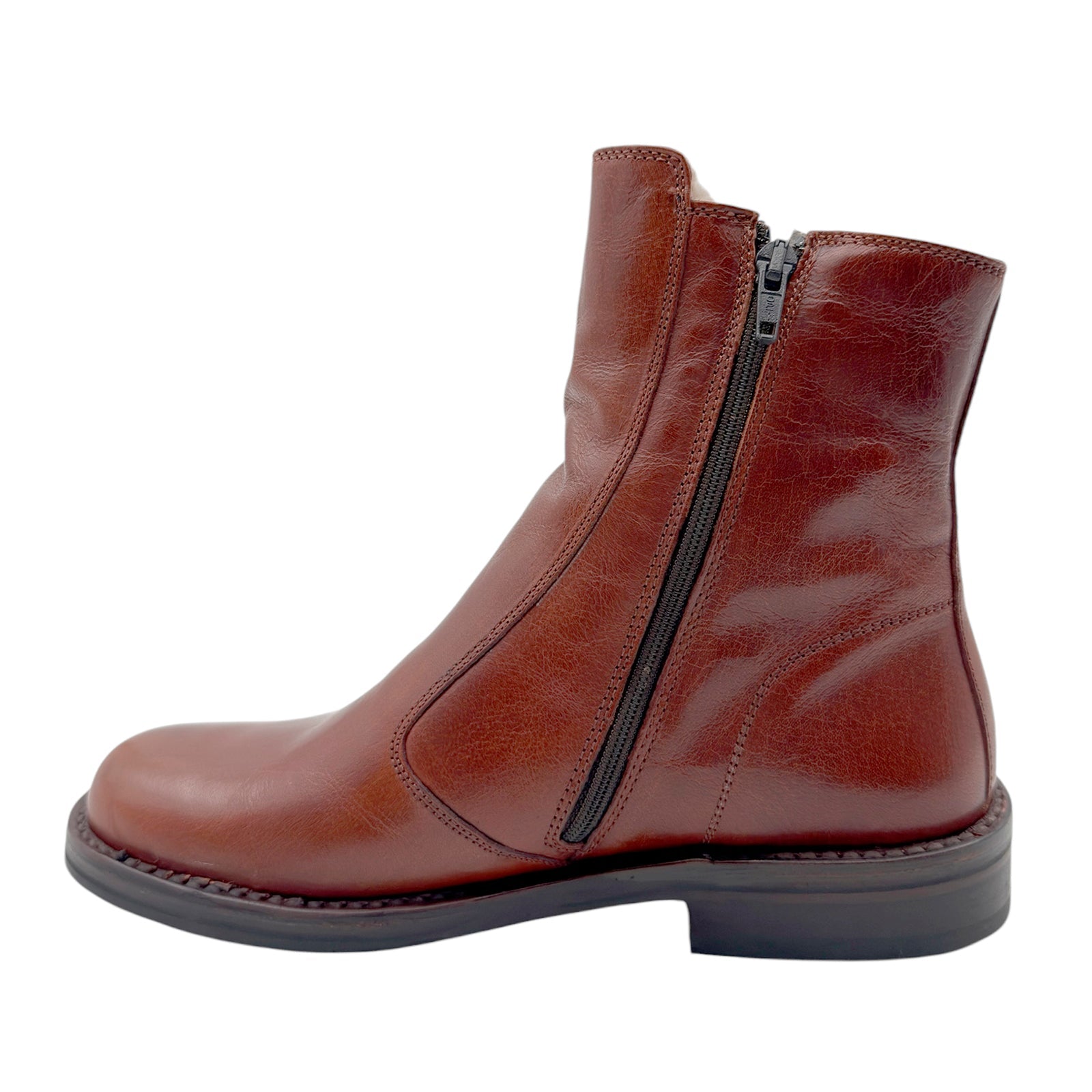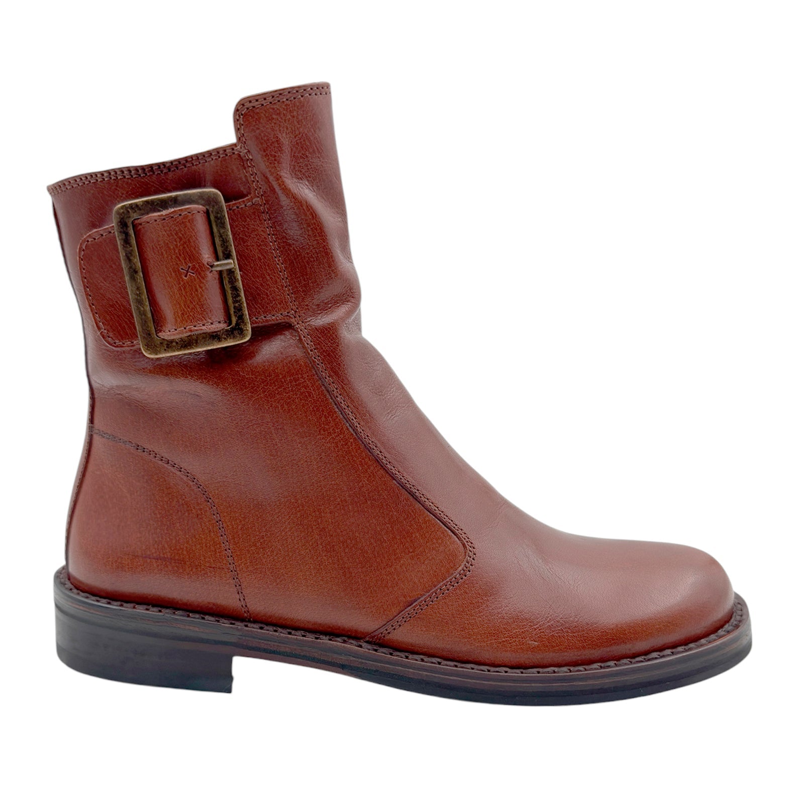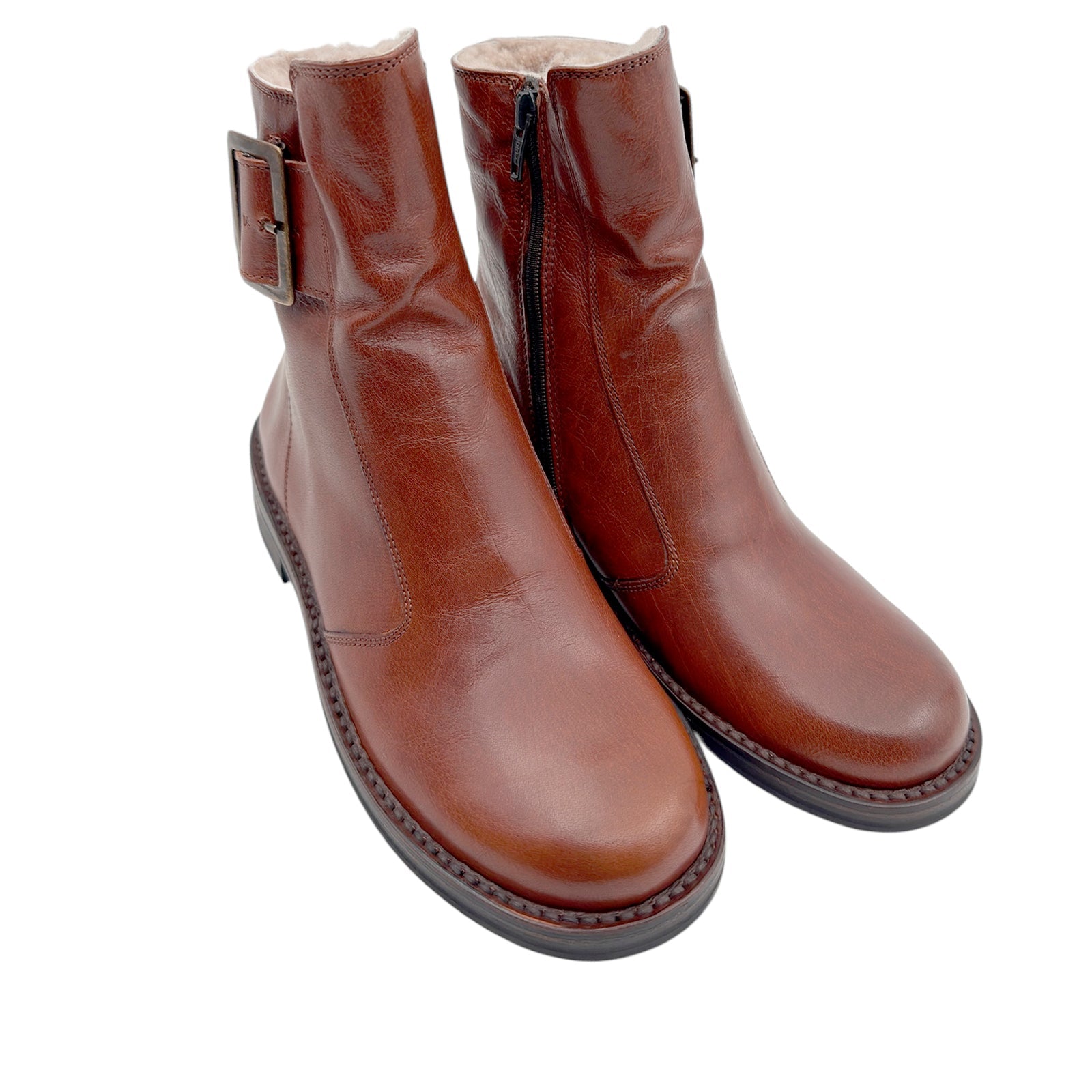 Klassisk Bubetti damestøvle i cognac kalveskind foret med lækkert, blødt merinould. Støvlen har lynlås på indersiden og et stort, flot pyntespænde.