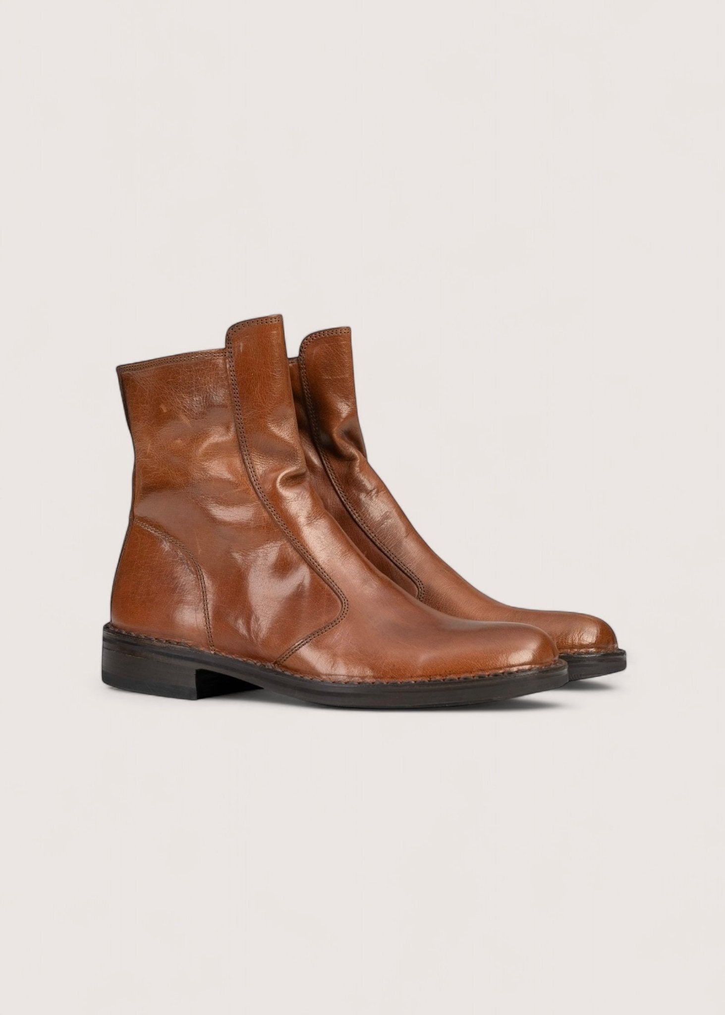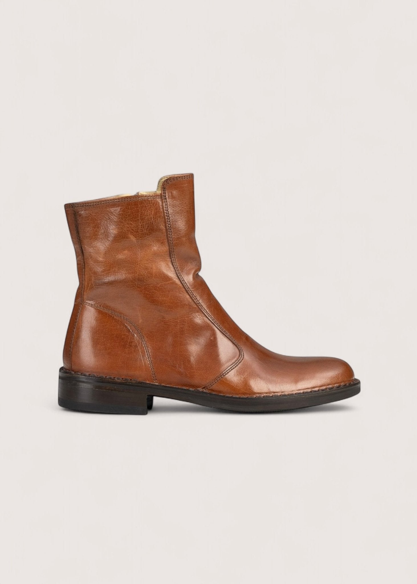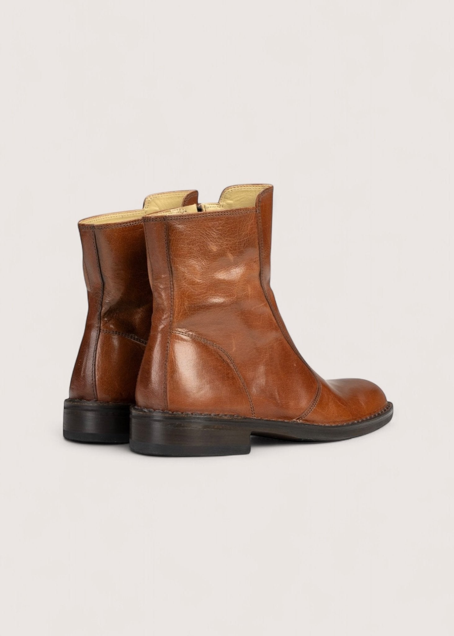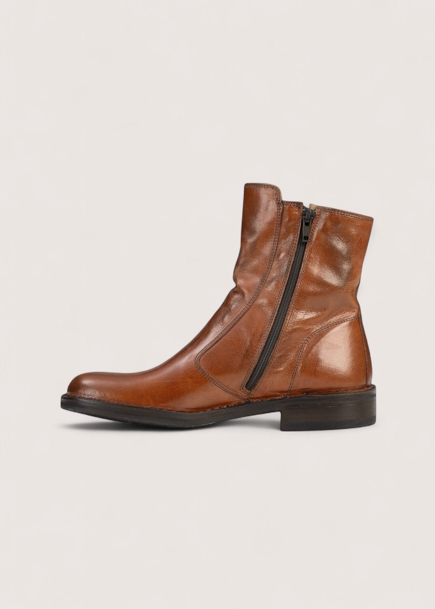 Smuk klassisk støvle med indvendig lynlås i cognac skind. Støvlen styles nemt til både kjole og bukser. Et stilrent og tidløst design der passer ind i enhver garderobe.