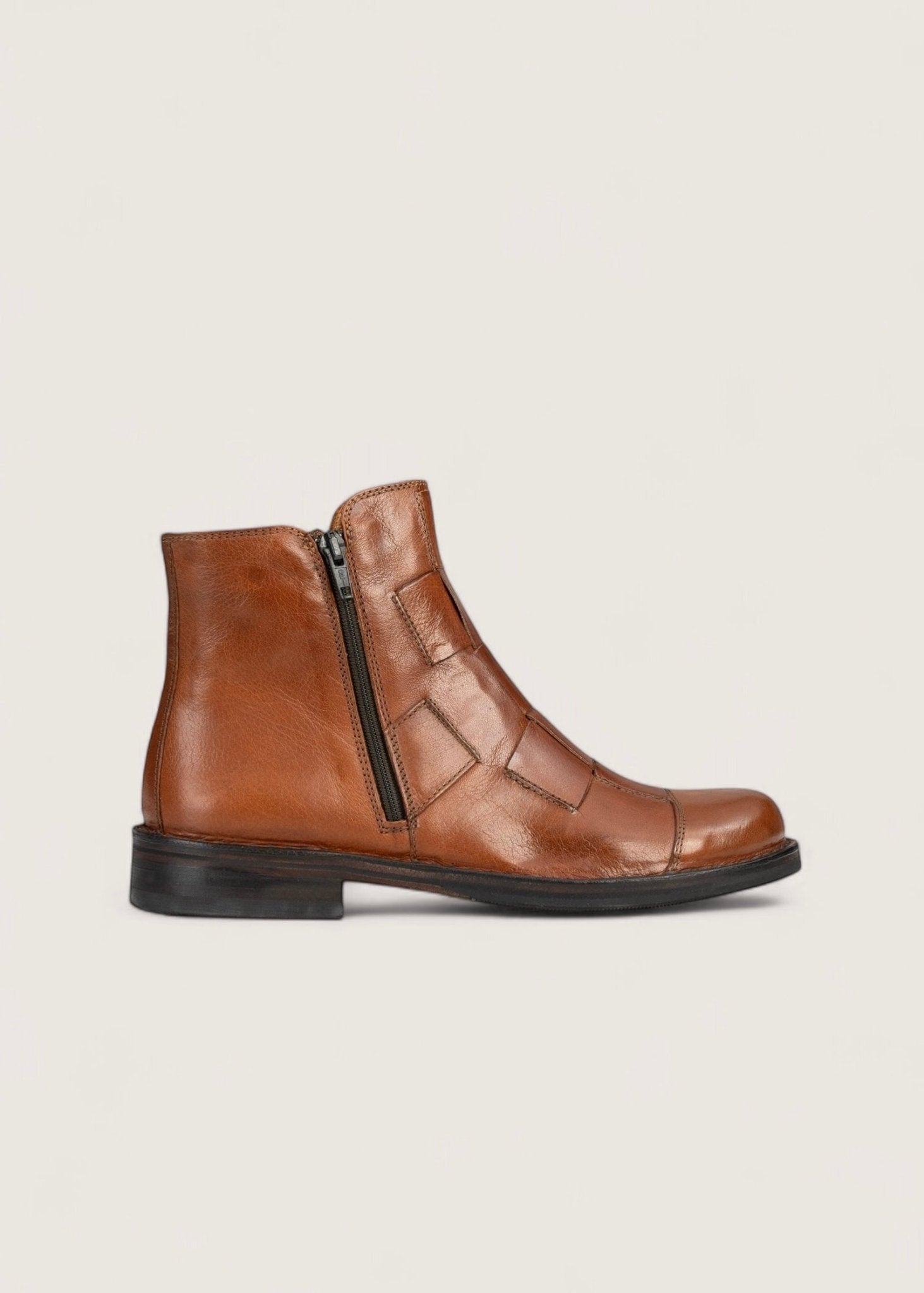 Klassisk Bubetti støvle i en flot, varm cognac. Støvlen er lavet i hele stykker kalveskind og har bred flet samt lynlås i begge sider. Lavet på skindsåler betrukket med sort gummi.