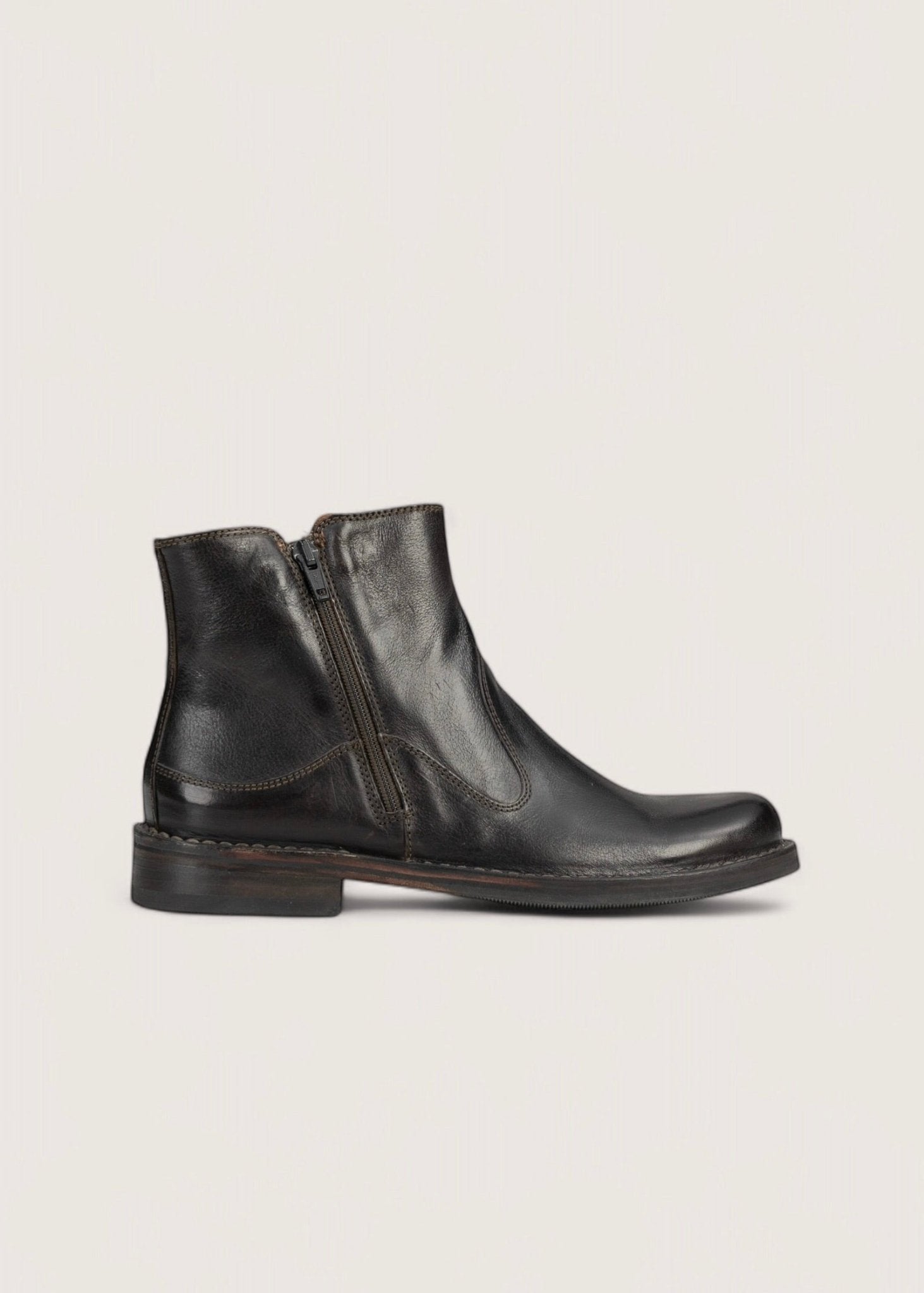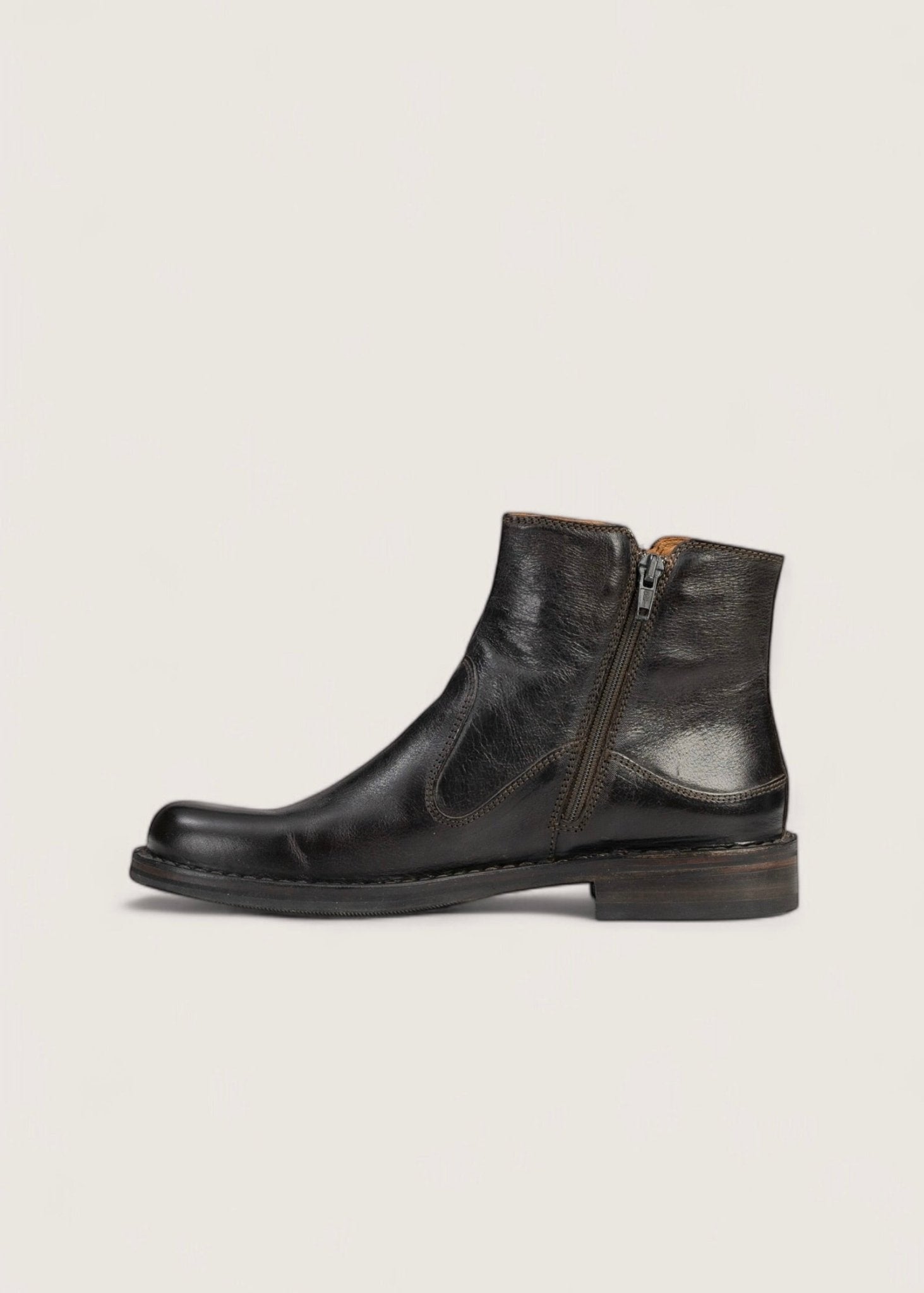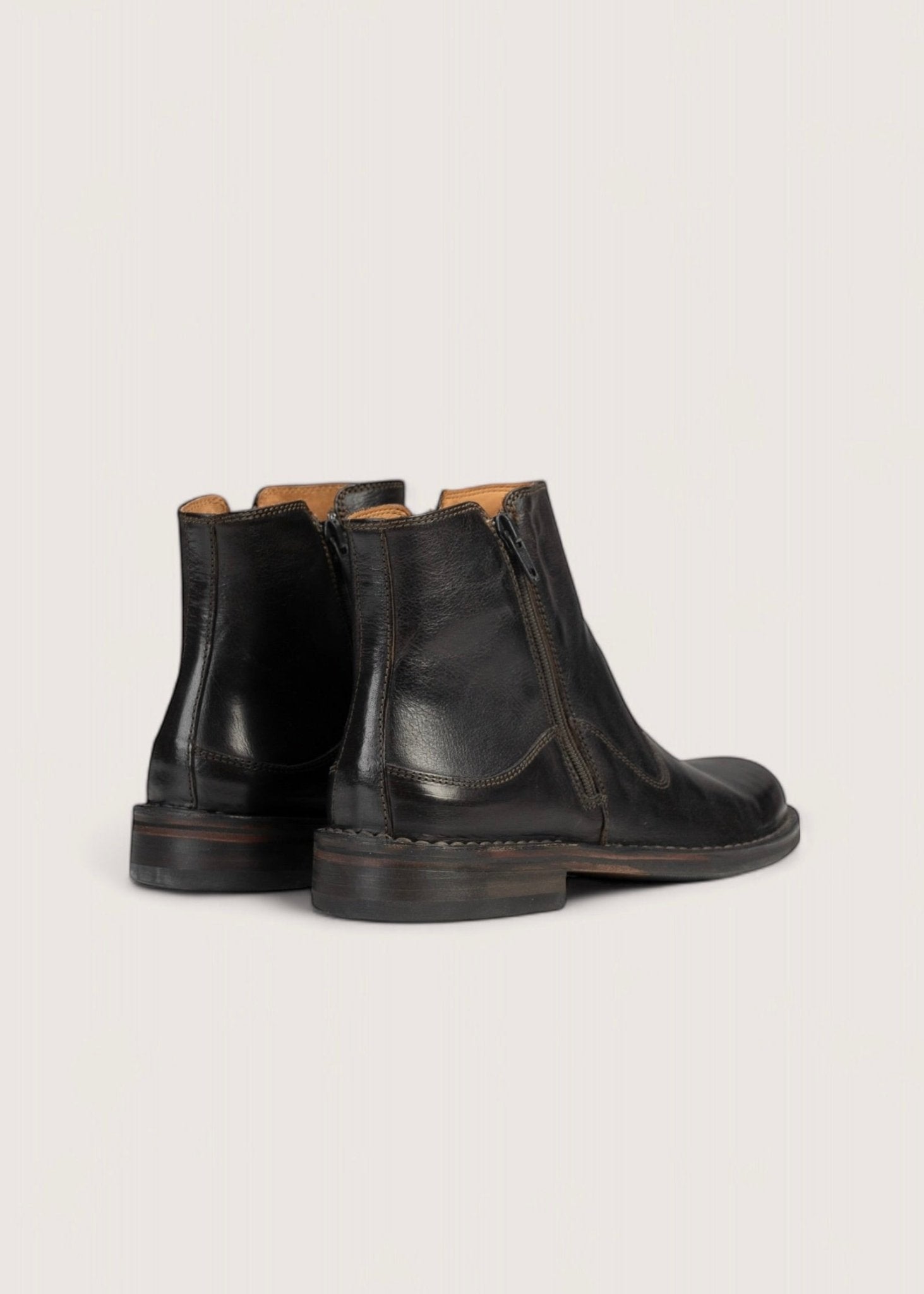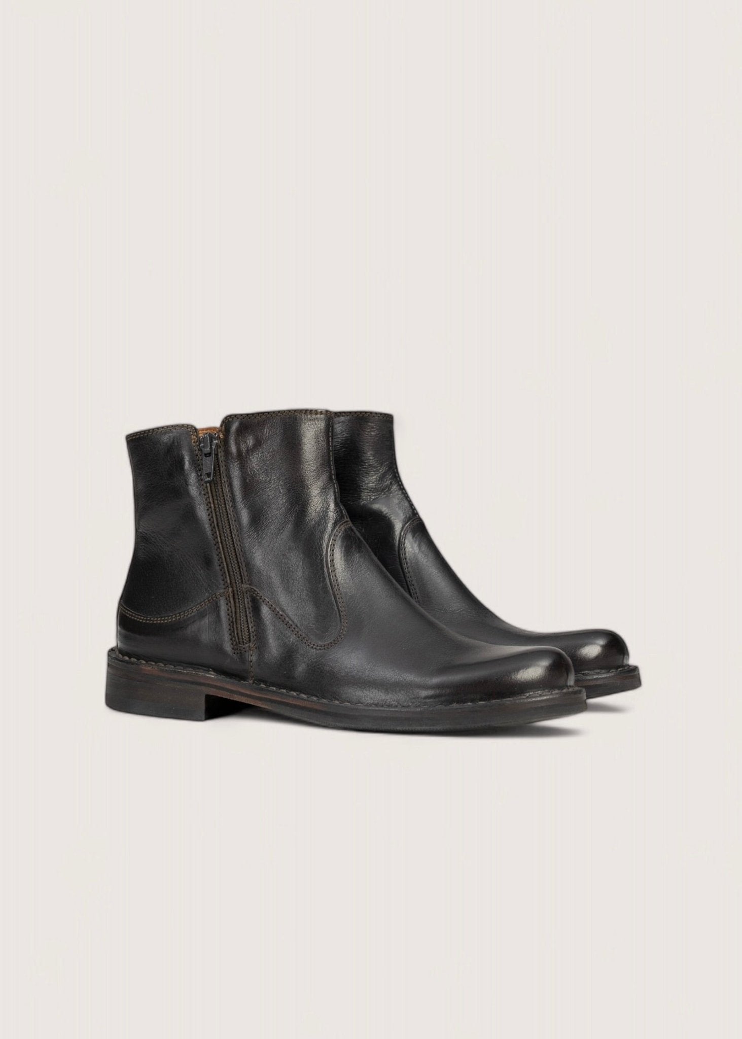 Mørkebrun klassisk skindstøvle med kort skaft og lynlås i begge sider, så den er nem at smutte i. Støvlen styles flot til både kjole og bukser. Et stilrent og tidløst design der passer ind i enhver garderobe. Støvlen fås også på en bredere læst.