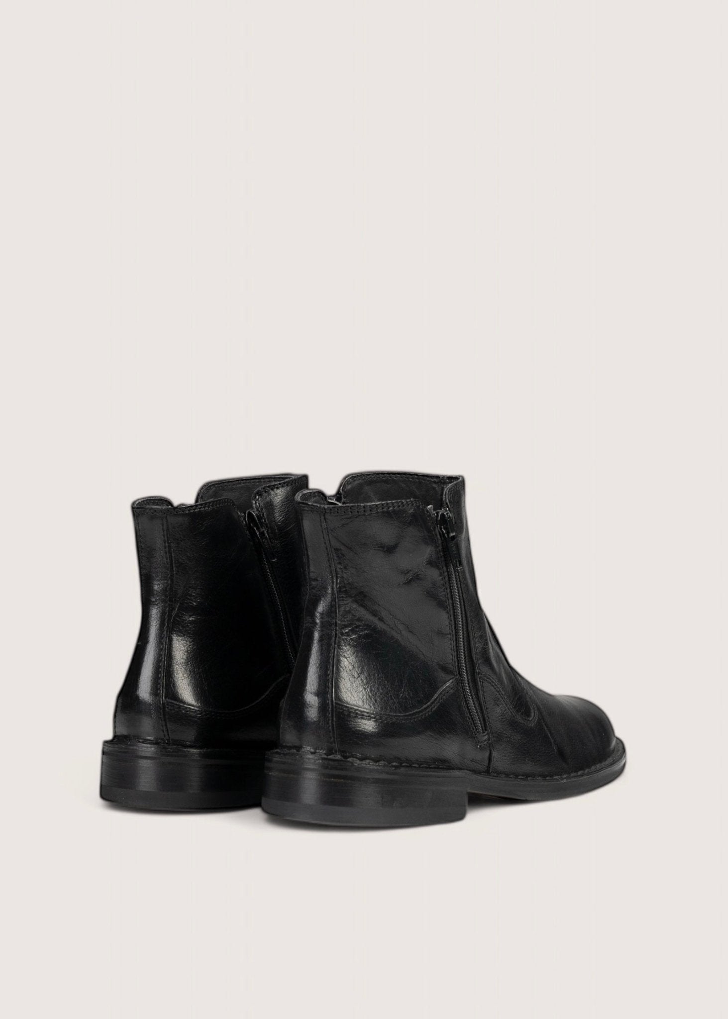 Sort klassisk skindstøvle med kort skaft og lynlås i begge sider, så den er nem at smutte i. Støvlen styles flot til både kjole og bukser. Et stilrent og tidløst design der passer ind i enhver garderobe. Støvlen fås også på en bredere læst.
