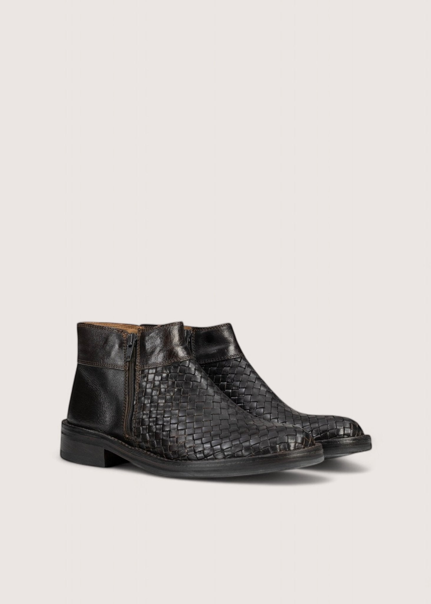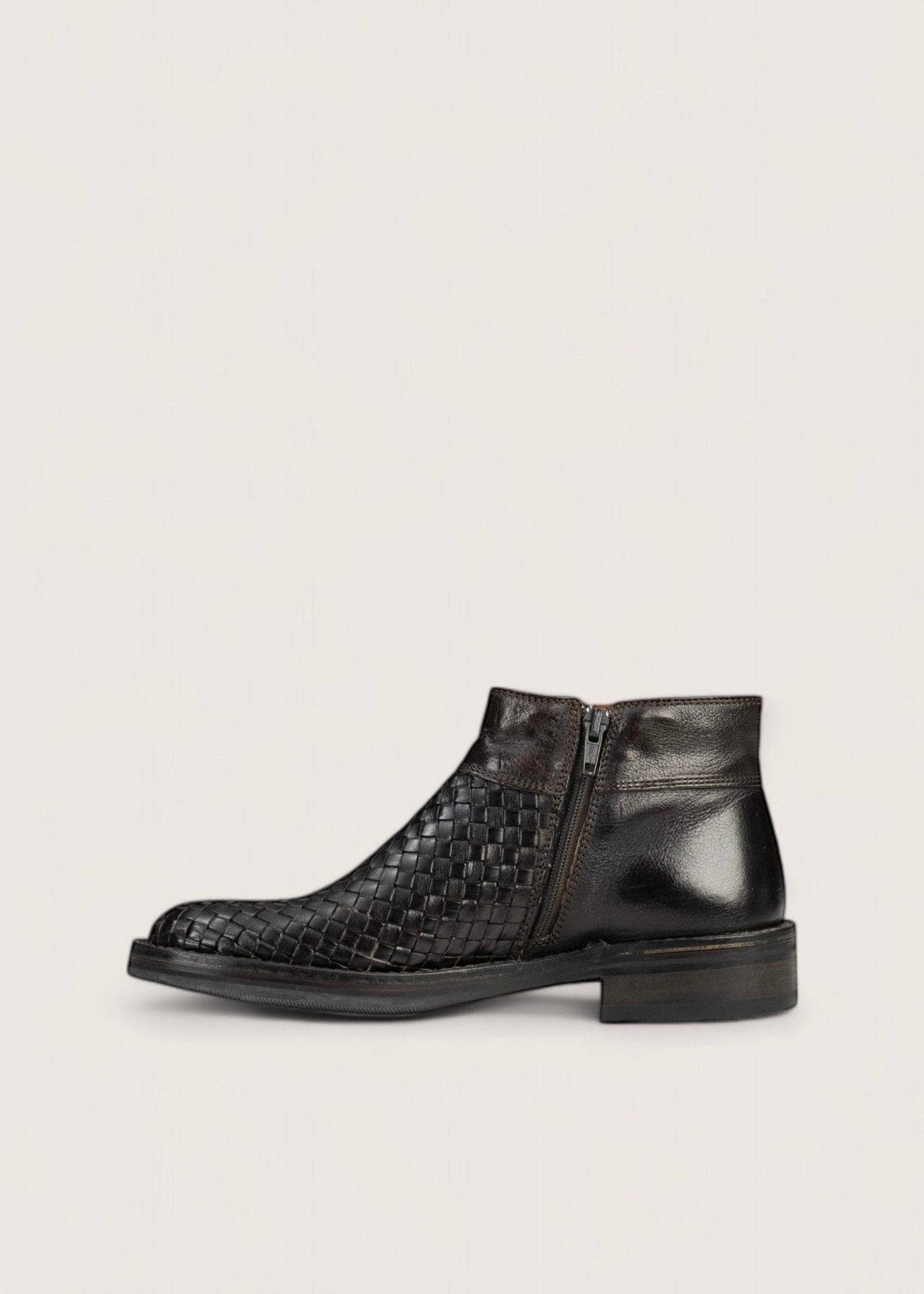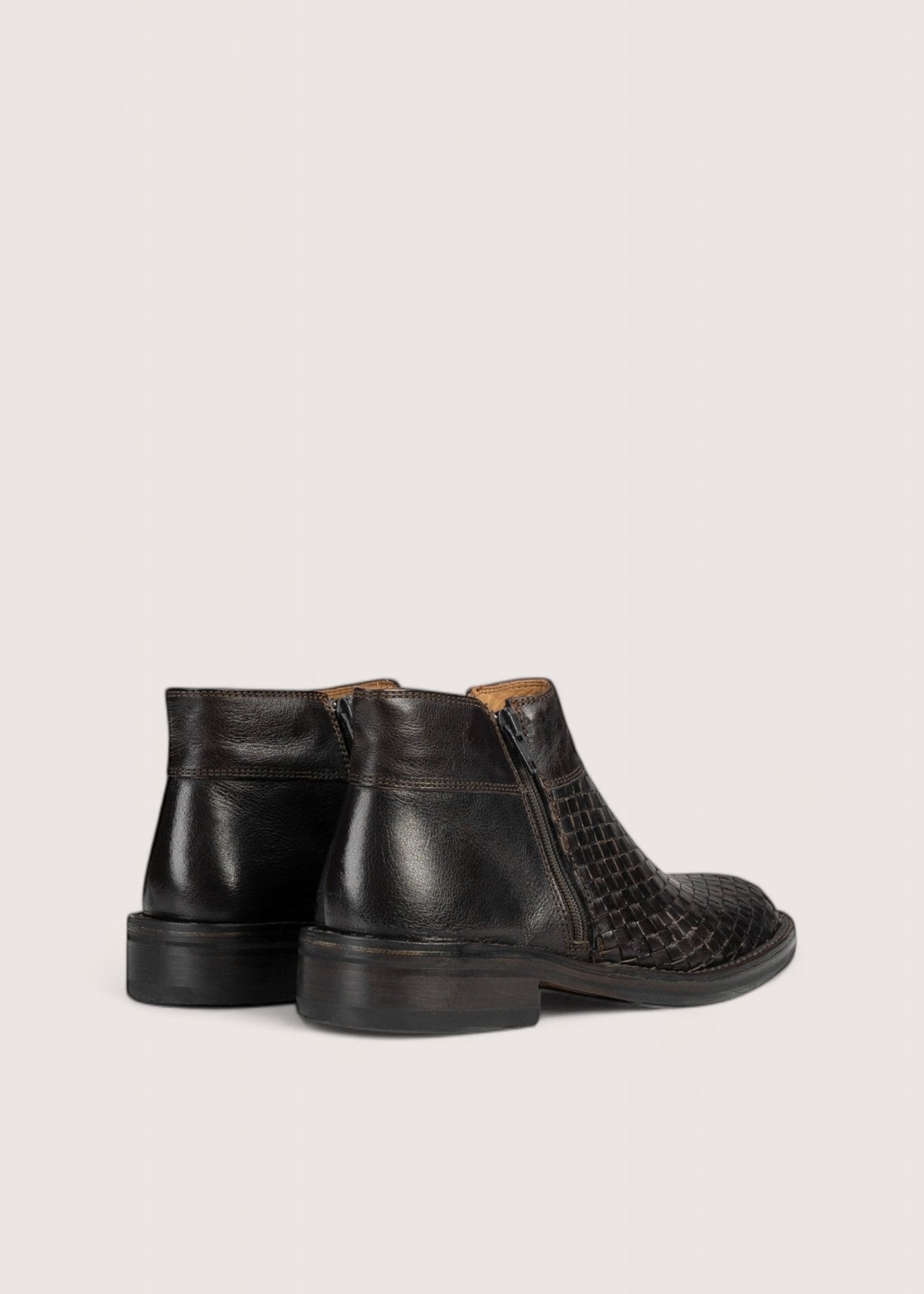 En klassiske! Kort, mørkebrun støvle lavet i vegetabilsk garvet skind. Støvlen har flet fortil og dobbelt lynlås samt lædersål betrukket med sort gummi.