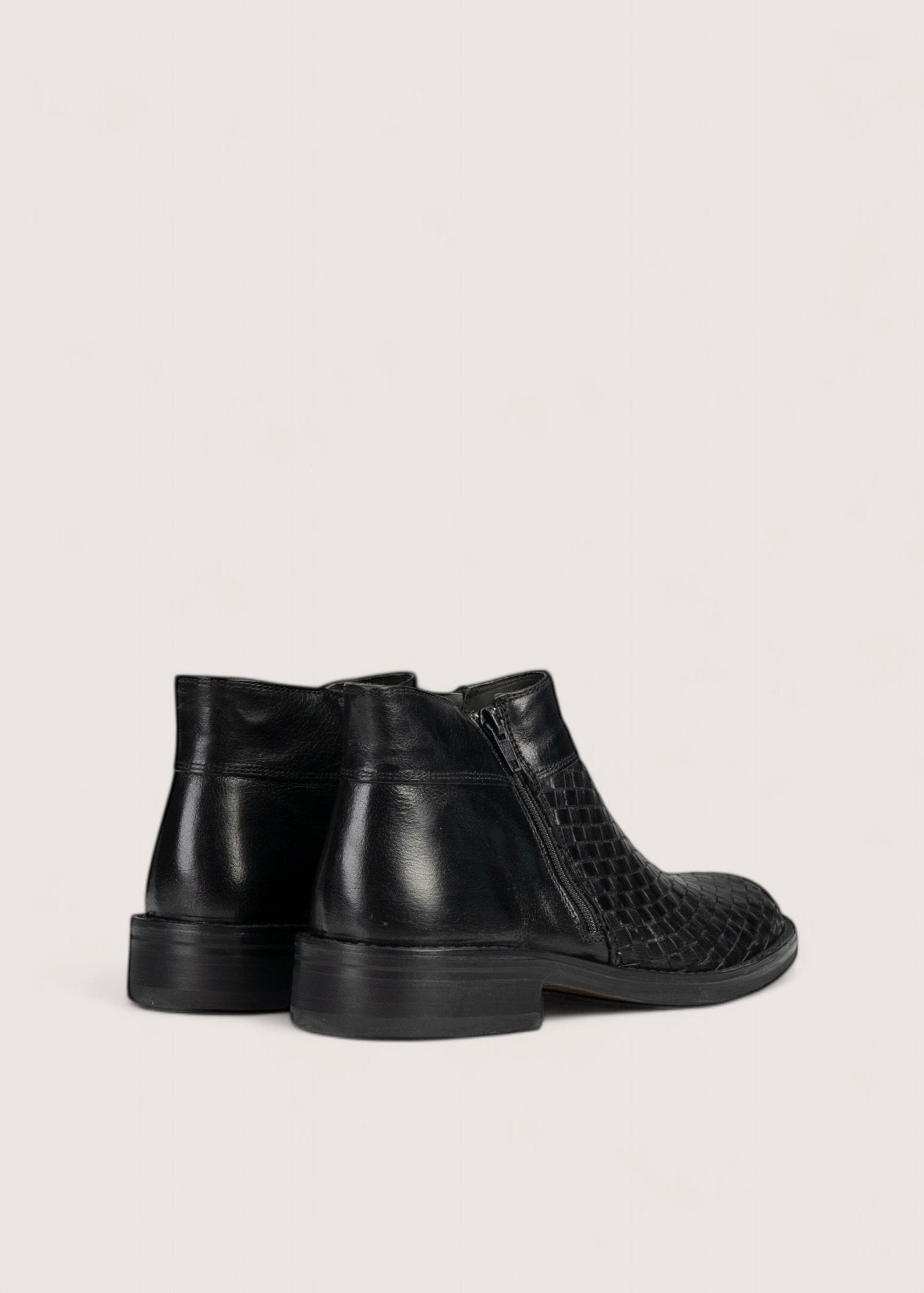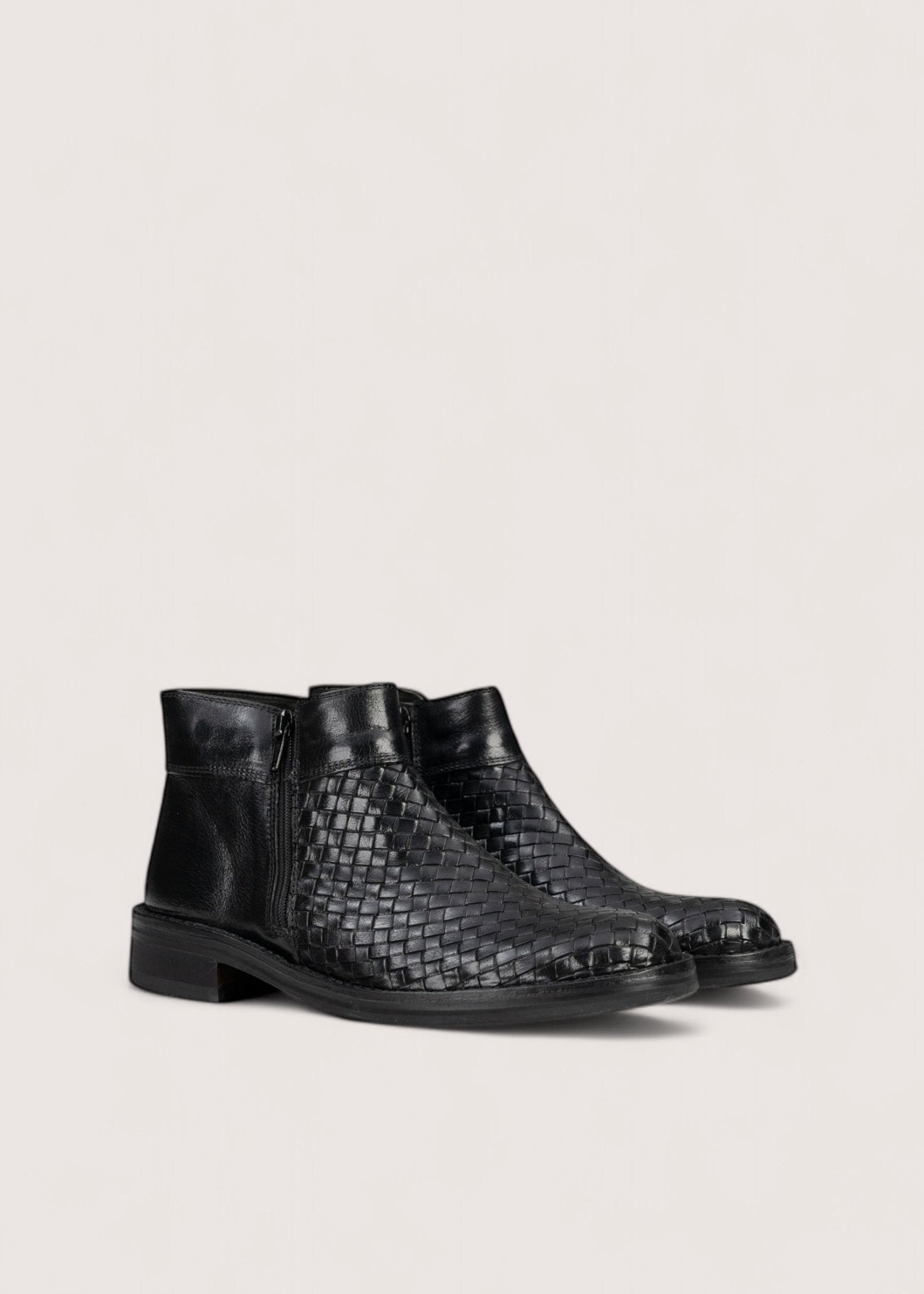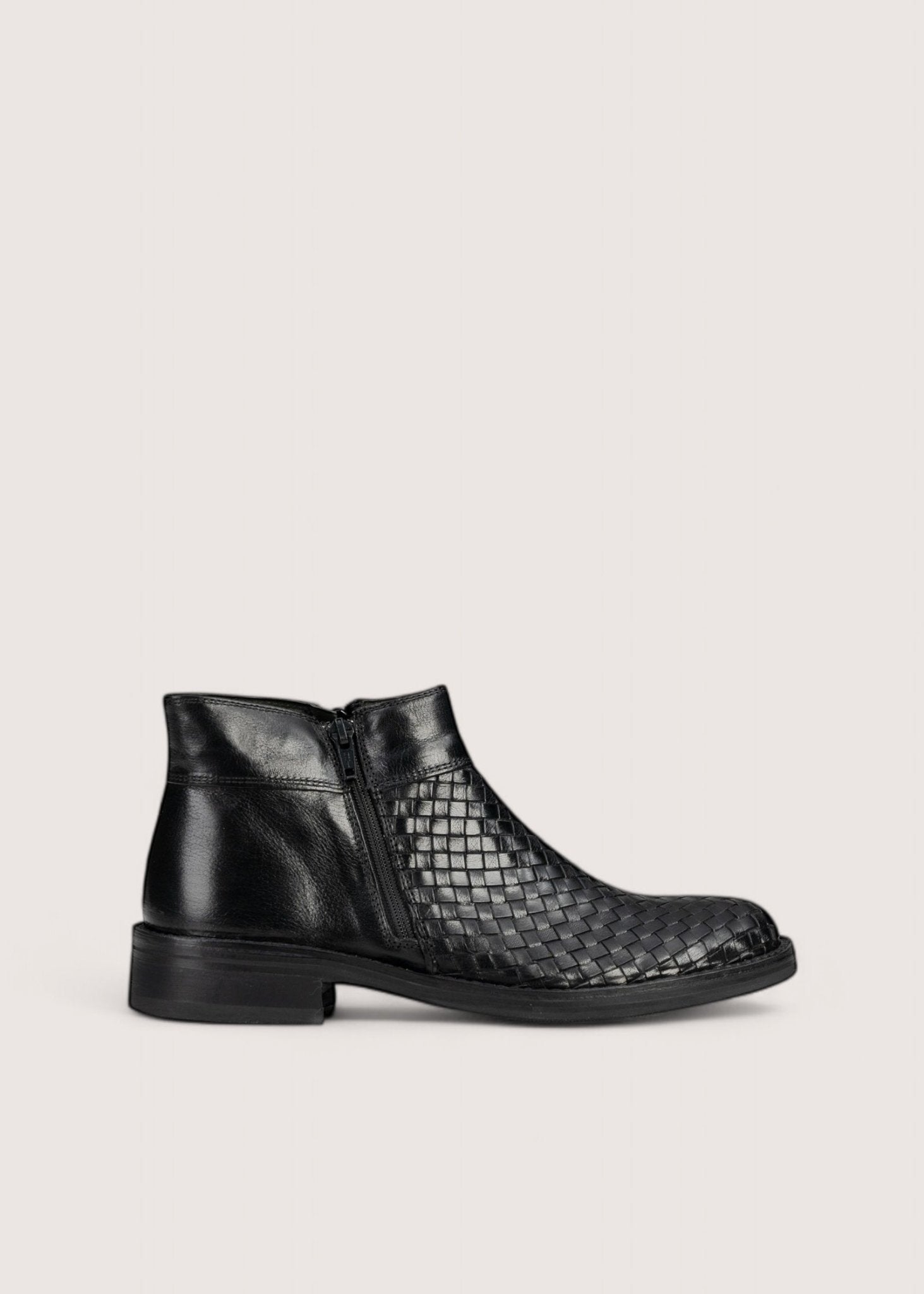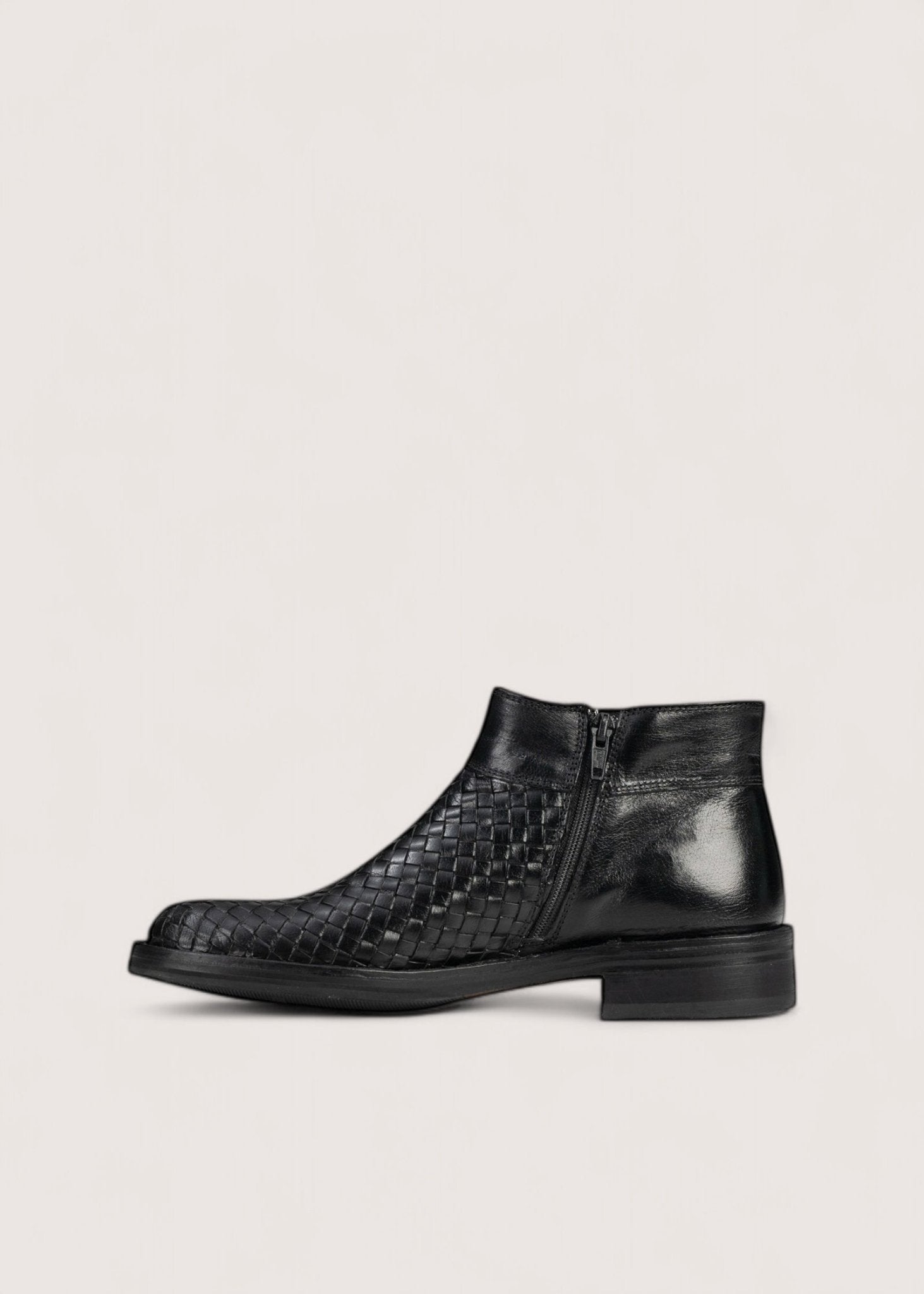 En klassiske! Kort, sort støvle lavet i vegetabilsk garvet skind. Støvlen har flet fortil og dobbelt lynlås samt lædersål betrukket med sort gummi.