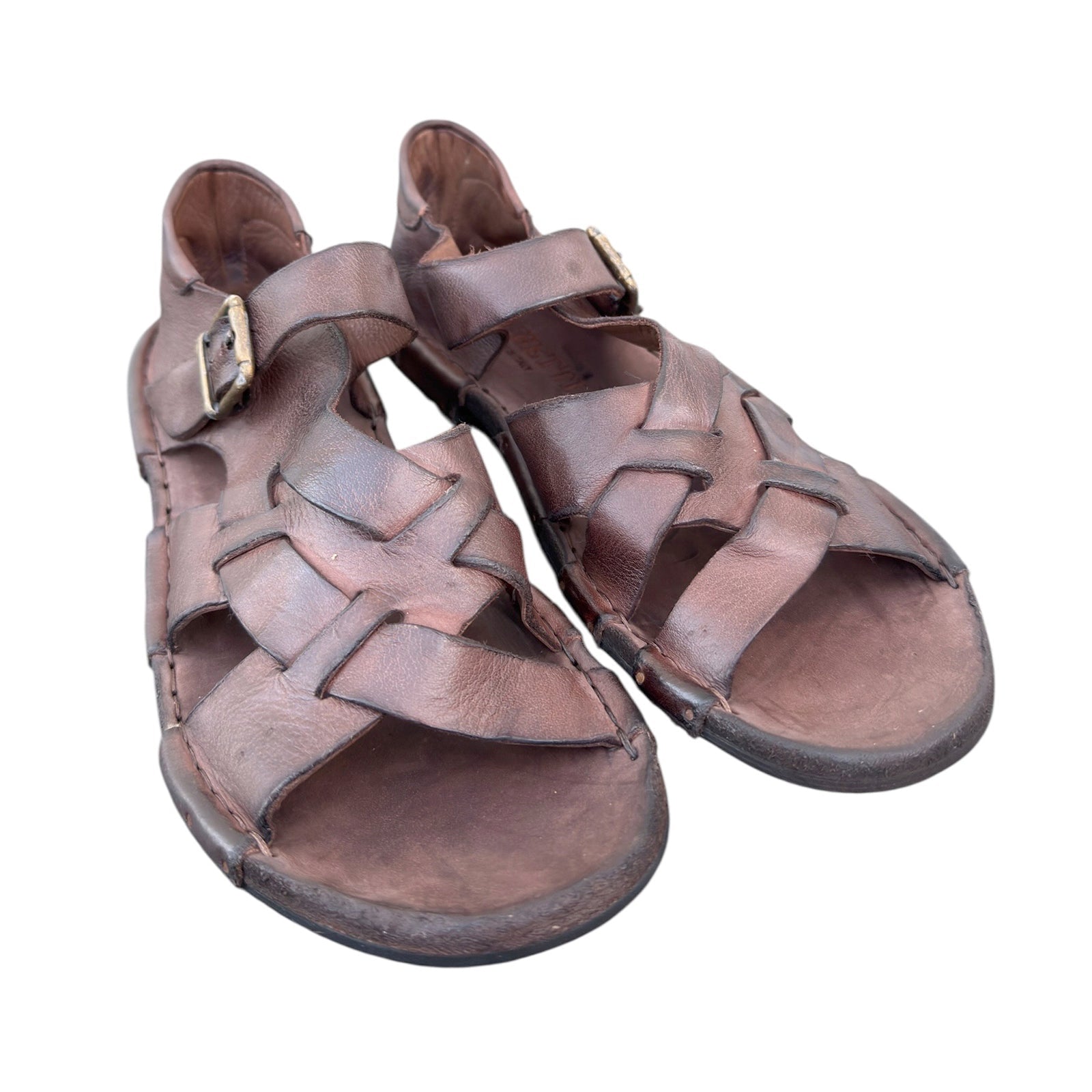 Sandal med flettede remme i vegetabilsk garvet, vasket, mørke brun skind
