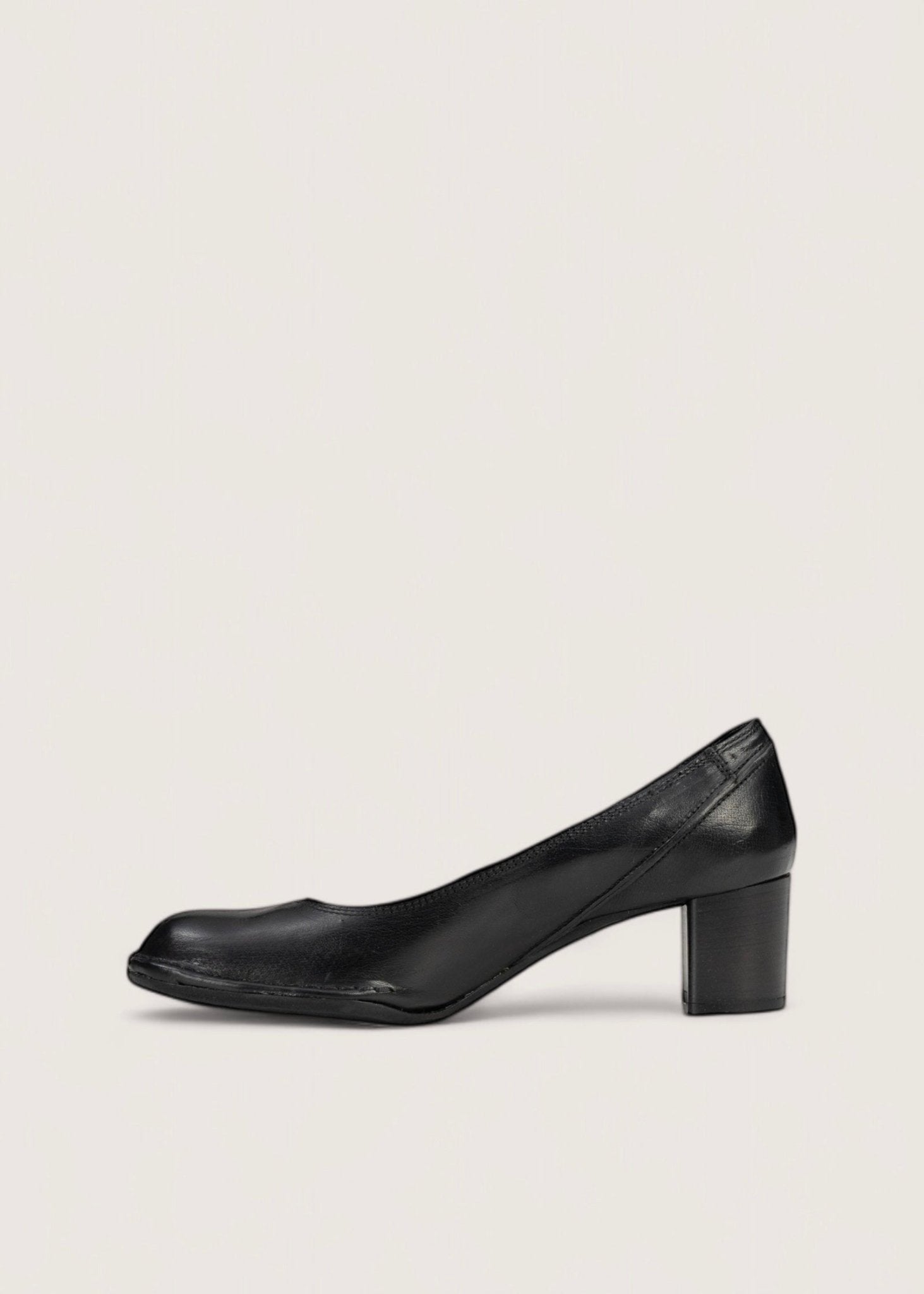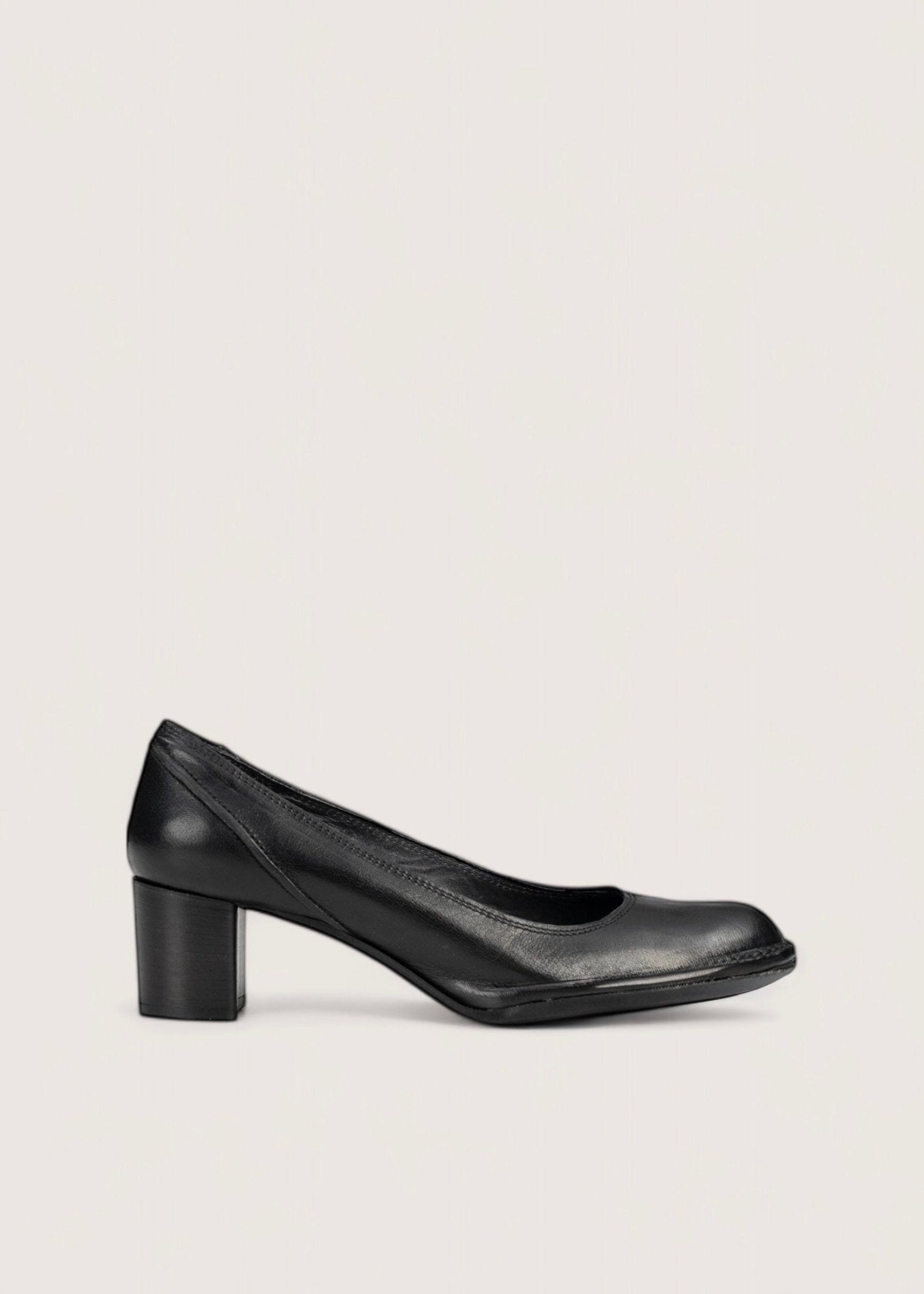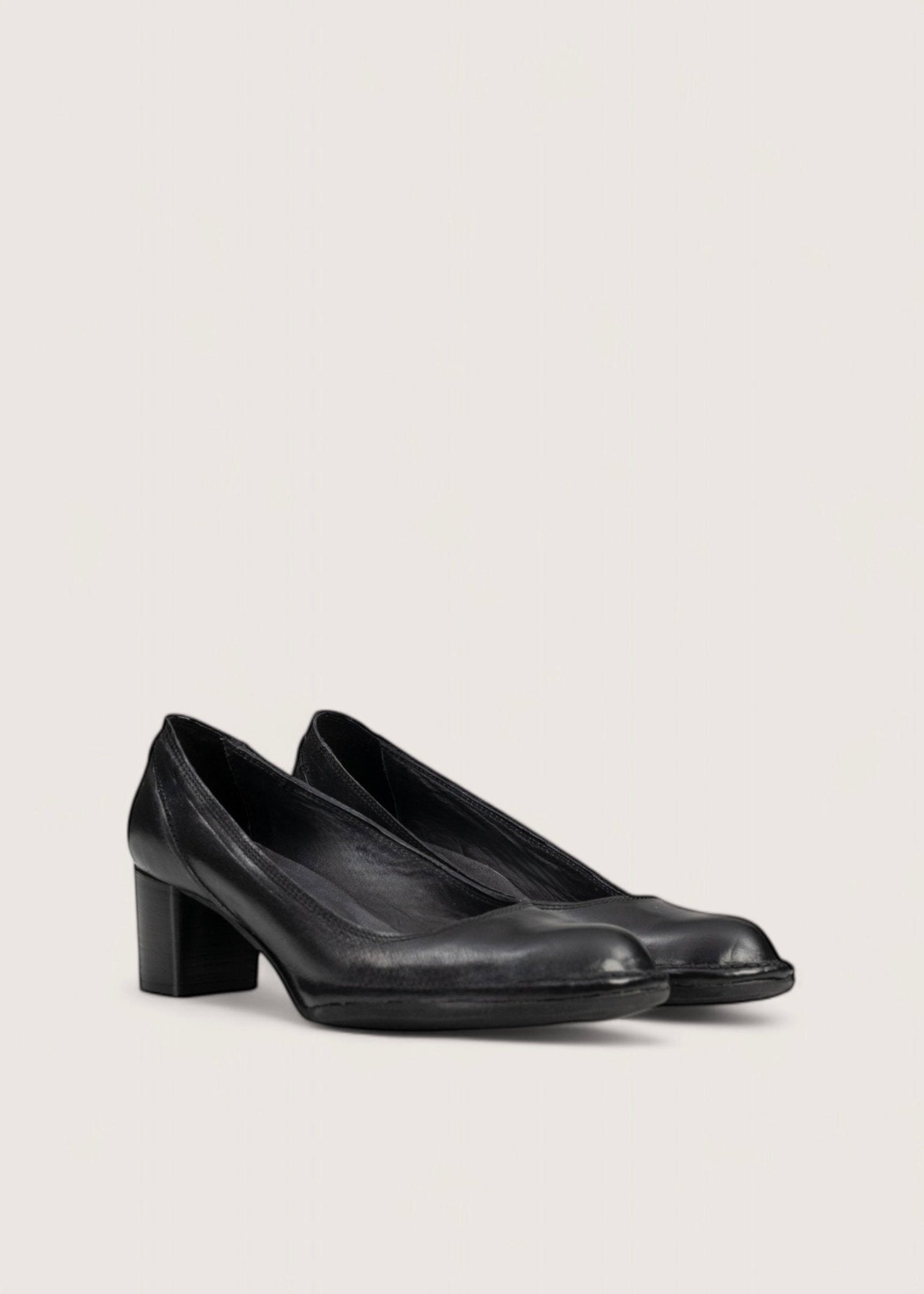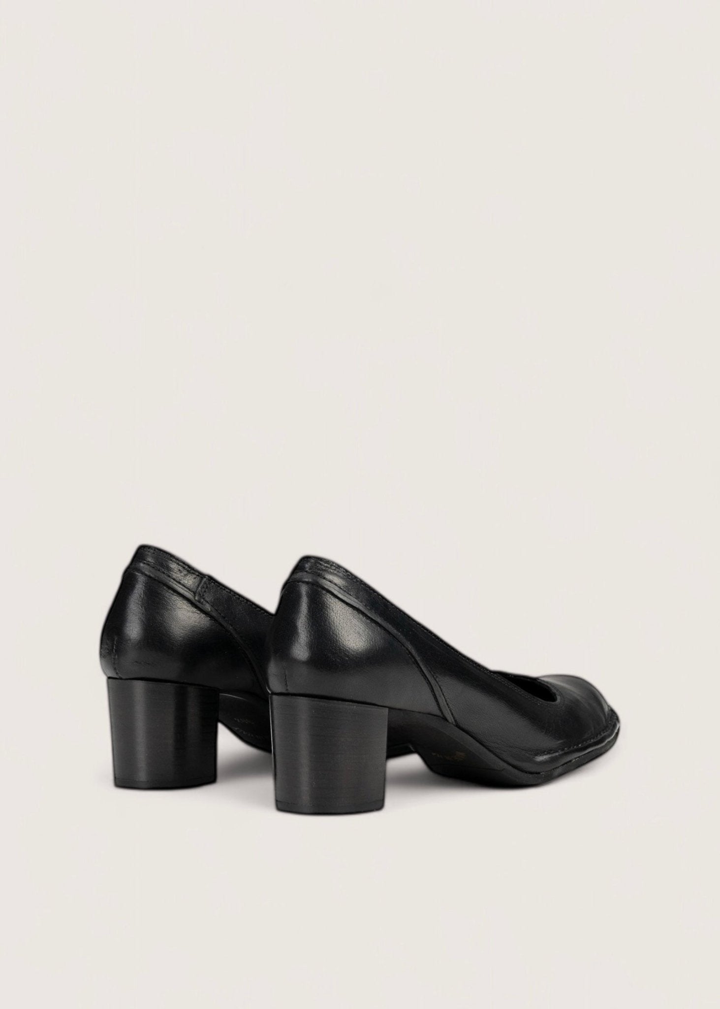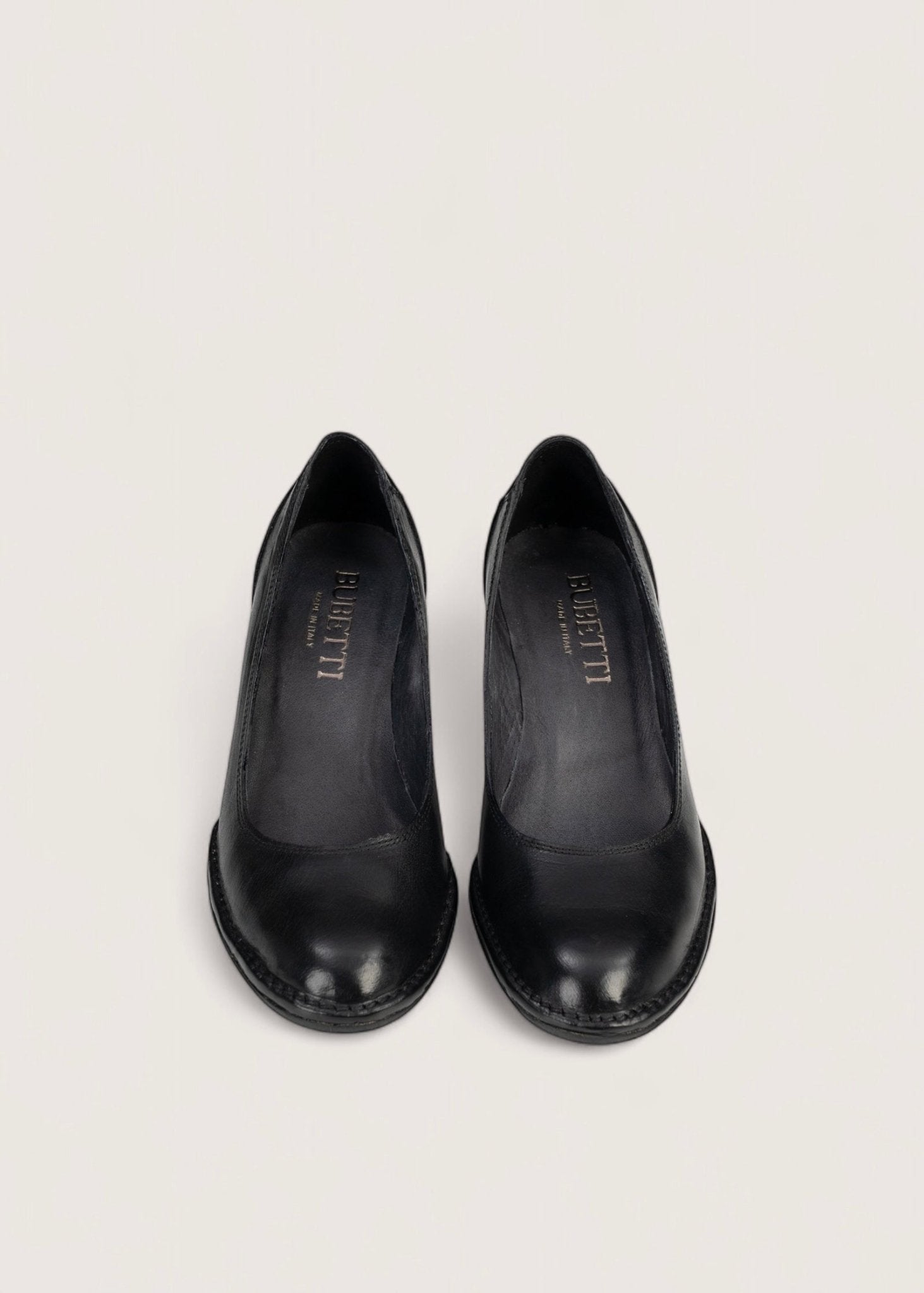 Elegant og helt enkel pump fra Bubetti lavet i det skønneste, sorte kalveskind. Skoen har rund snude, rund udskæring fortil og en lille hæl, der måler 5 cm. Lavet på gummisål.