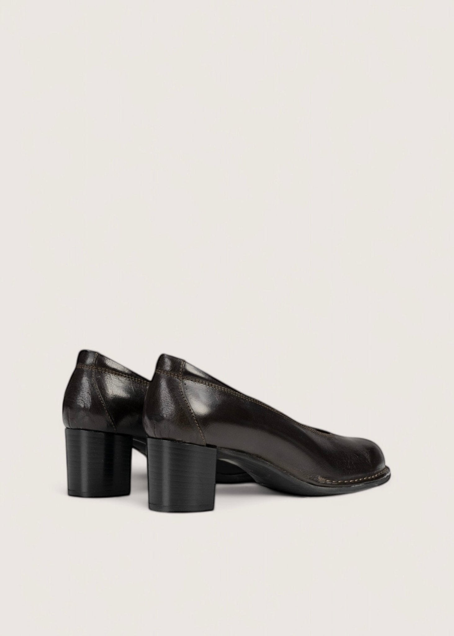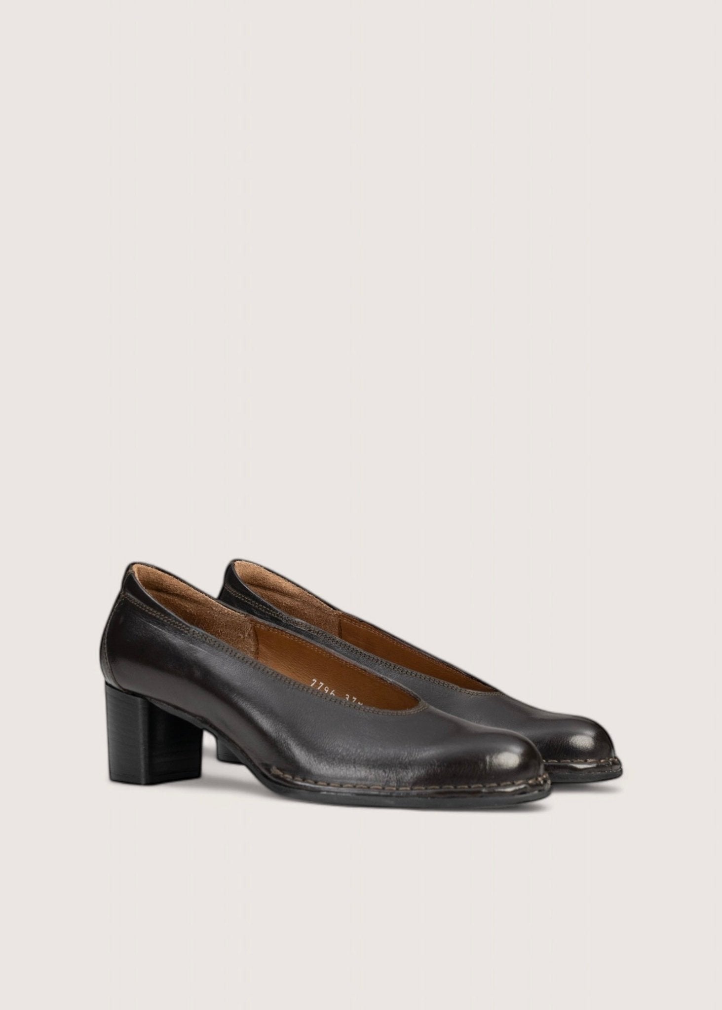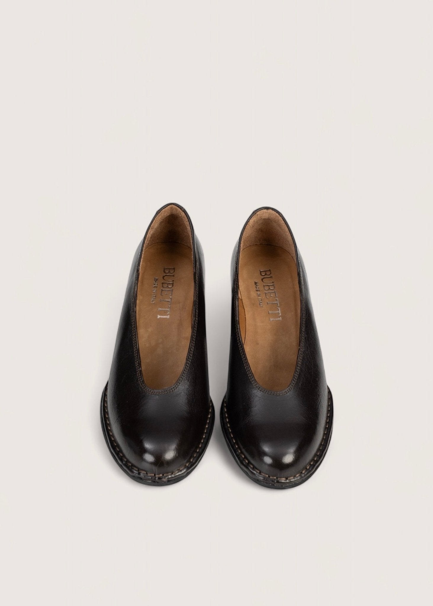 Elegant og enkel pump fra Bubetti lavet i det skønneste, mørkebrune kalveskind. Skoen har rund snude og en 5 cm hæl. Lavet på gummisål.