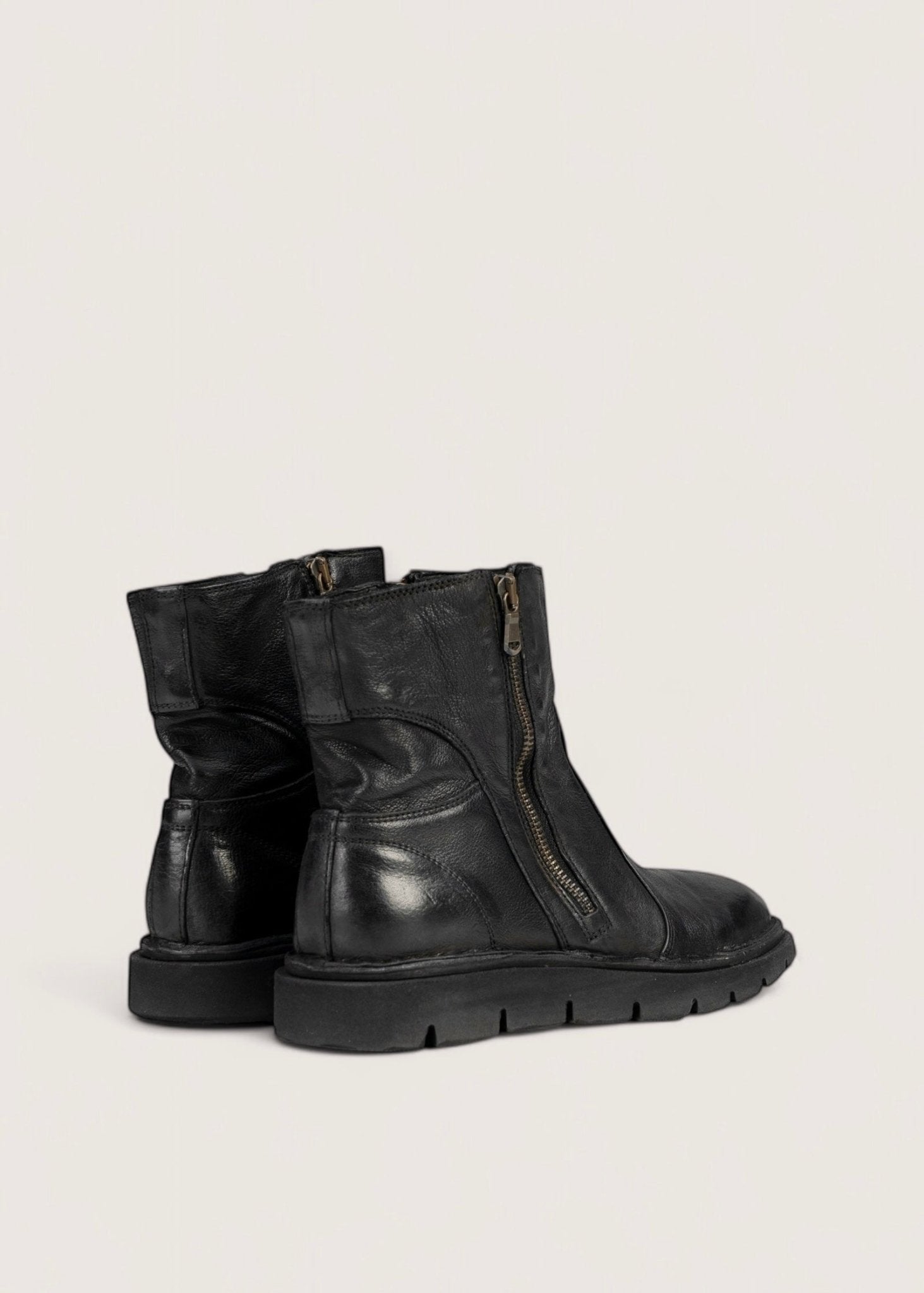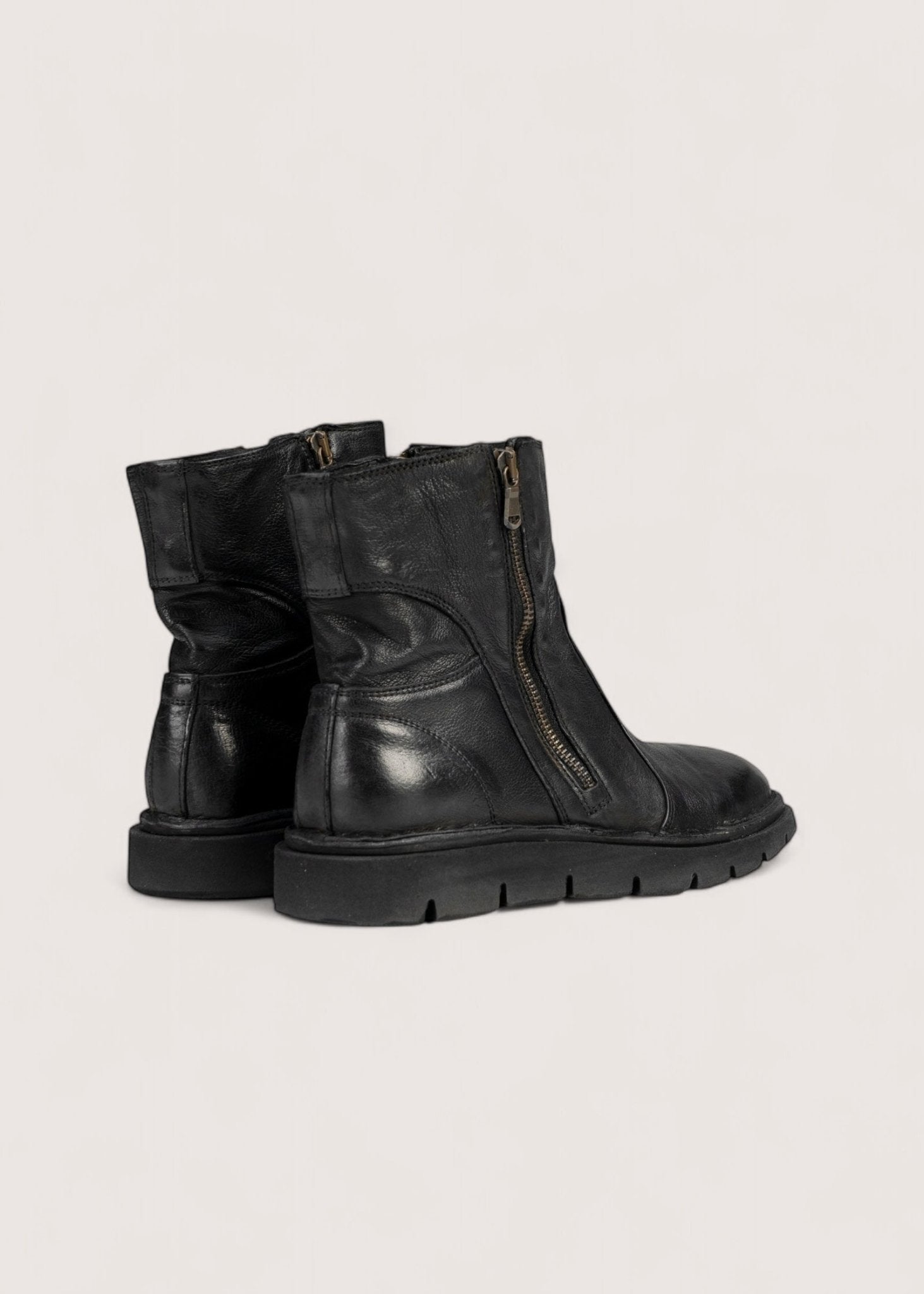 Lækker damestøvle i en flot varm, vasket sort lavet i hele stykker, vegetabilsk garvet kalveskind, der gør støvlen usædvanlig slidstærk og giver den patina fra start. Støvlen har skjult pløs og to lynlåse monteret med Bubettis unikke micro letvægtssål Ombra. Skindets rå og unikke look opnås igennem en helt speciel vaskeproces - således kan hvert stykke fodtøj variere i skindet.