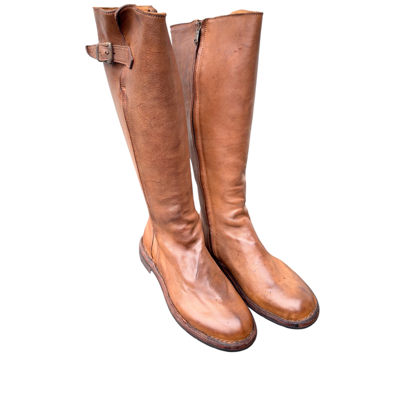 Superflot dame støvle med lang skaft og rund snude i en flot, lys brun kork farve, lavet i det lækreste vegetabilsk garvet skind foret med vegetabilsk skind. Støvlen har fået en speciel vask der giver den flotte rå finish. Indvendig lynlås og en dekorativ rem med spænde øverst på skaftet. Lavet på skindsål betrukket med en solid og slidstærk gummisål. Skøn komfort!