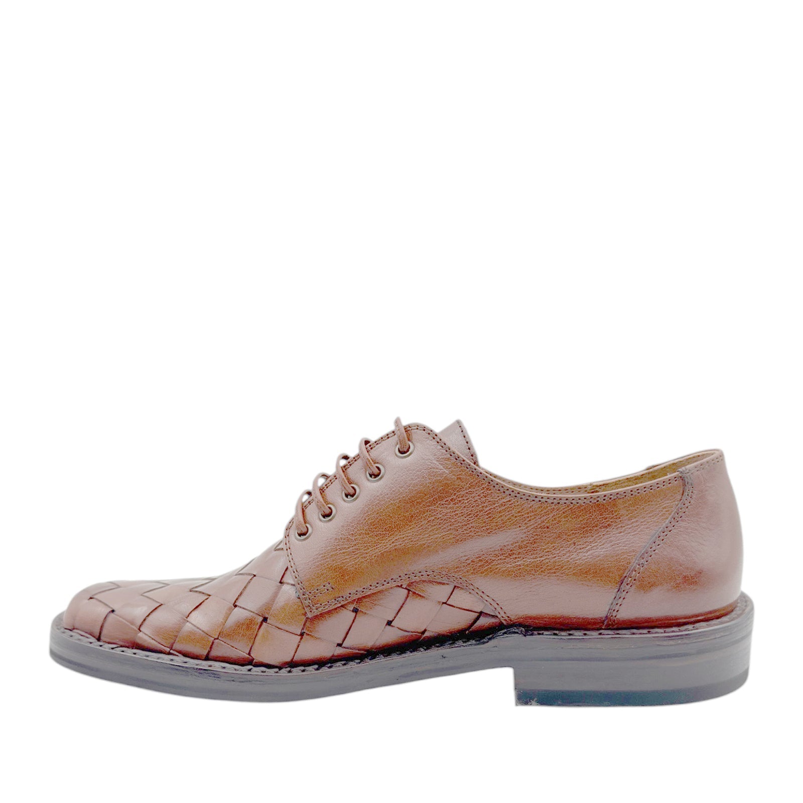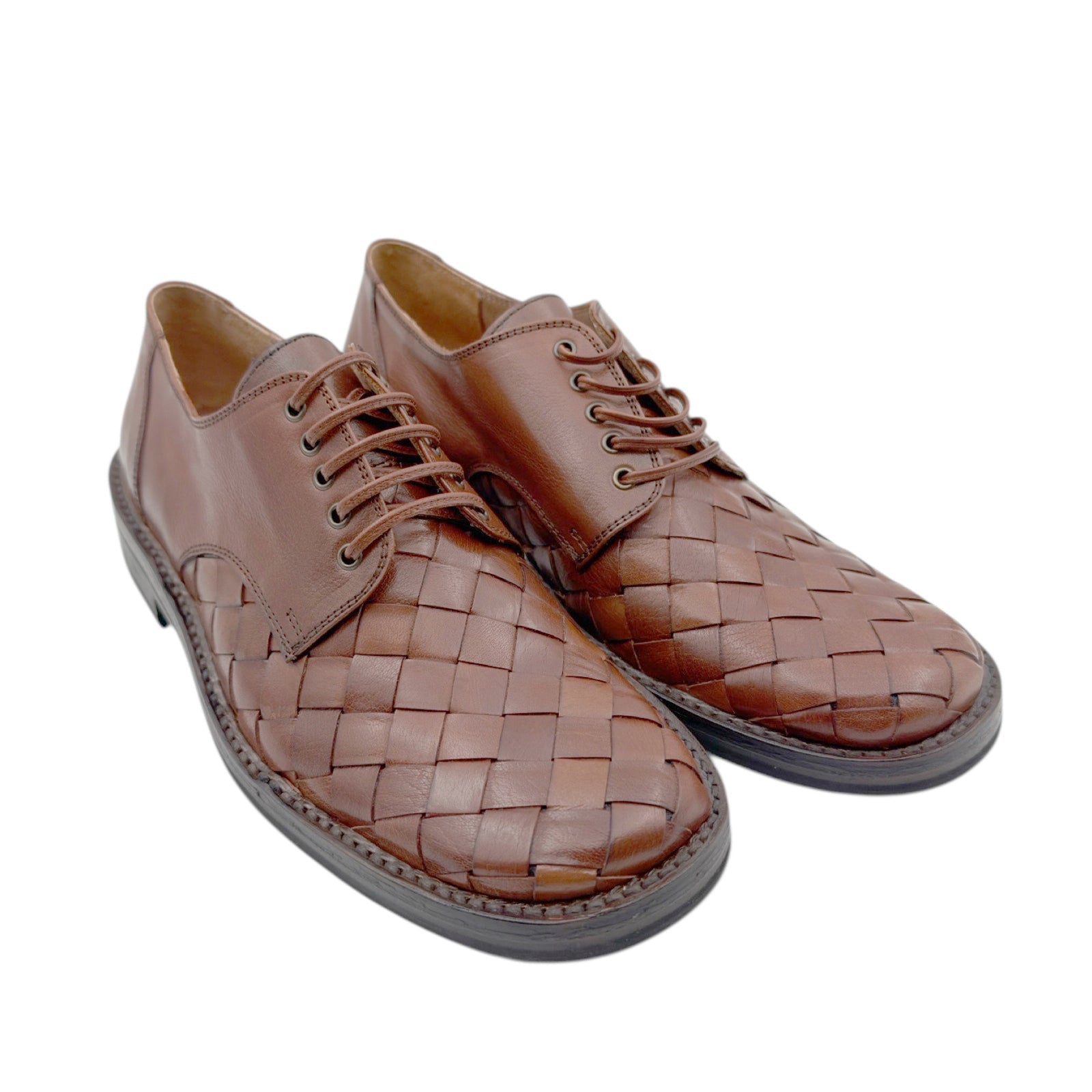 Klassisk herre snøresko i cognac skind med kantet snude og fem snørehuller. Skoen har flet skind fortil og glat skind bagtil. Lavet på skindsål betrukket med slidstærkt gummi.
