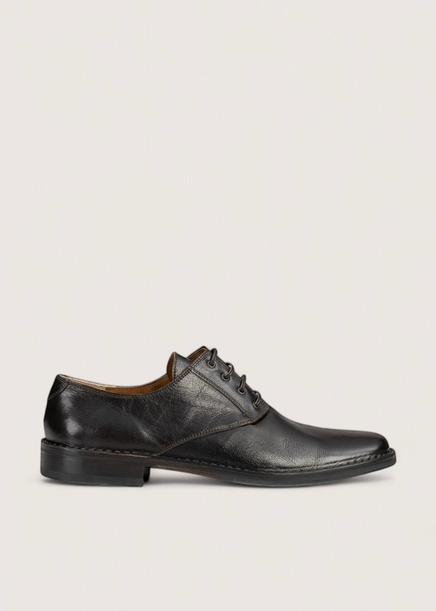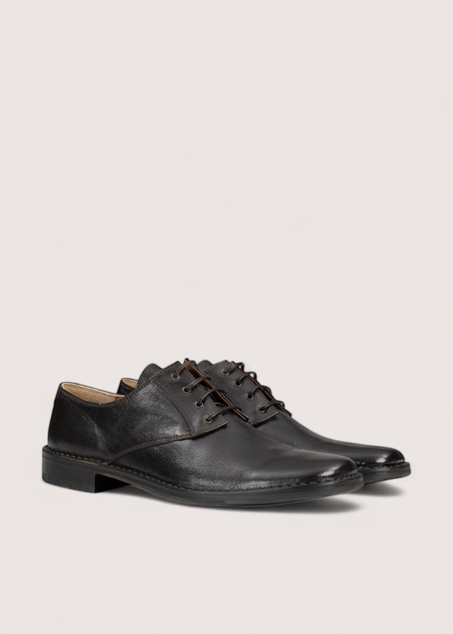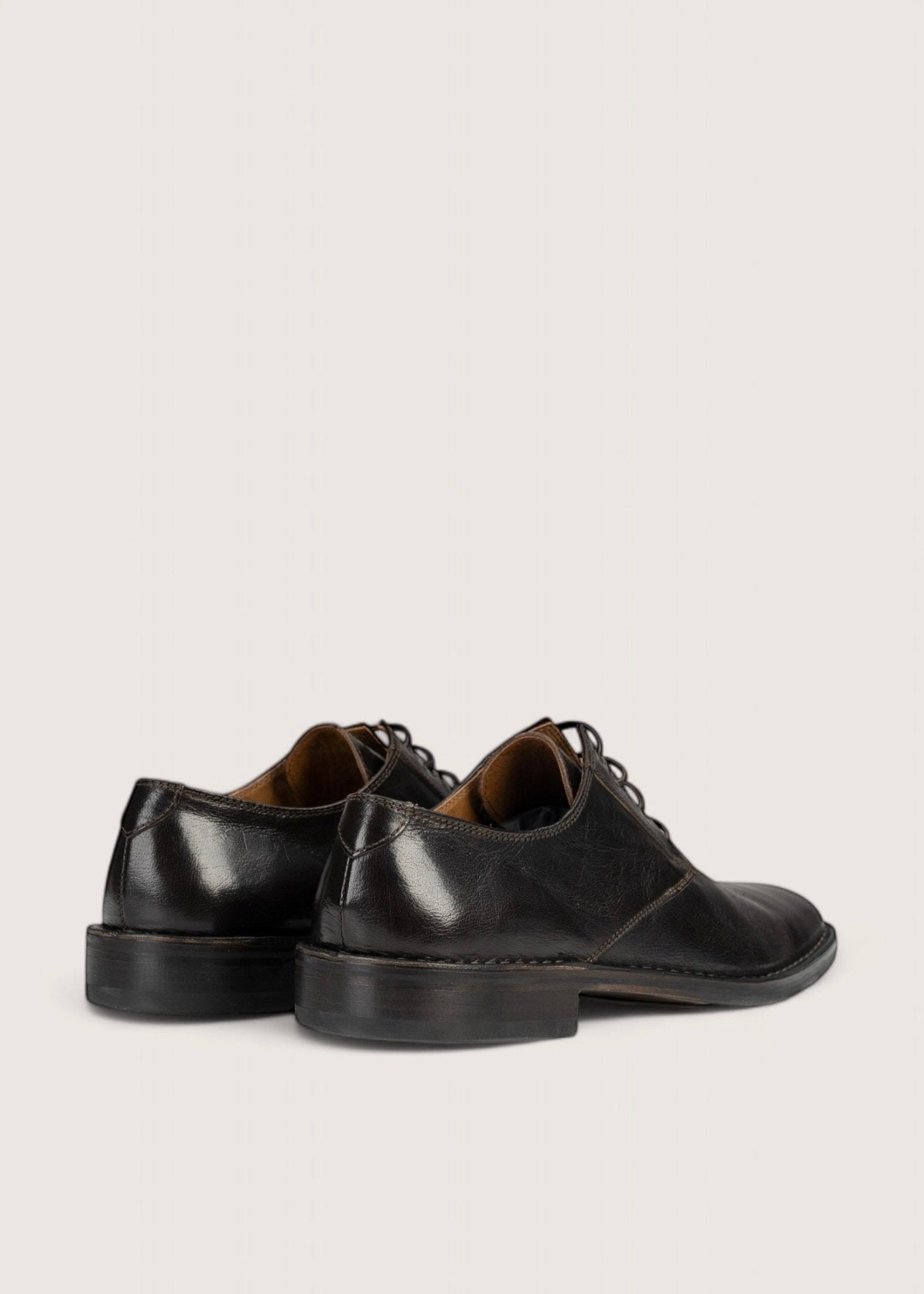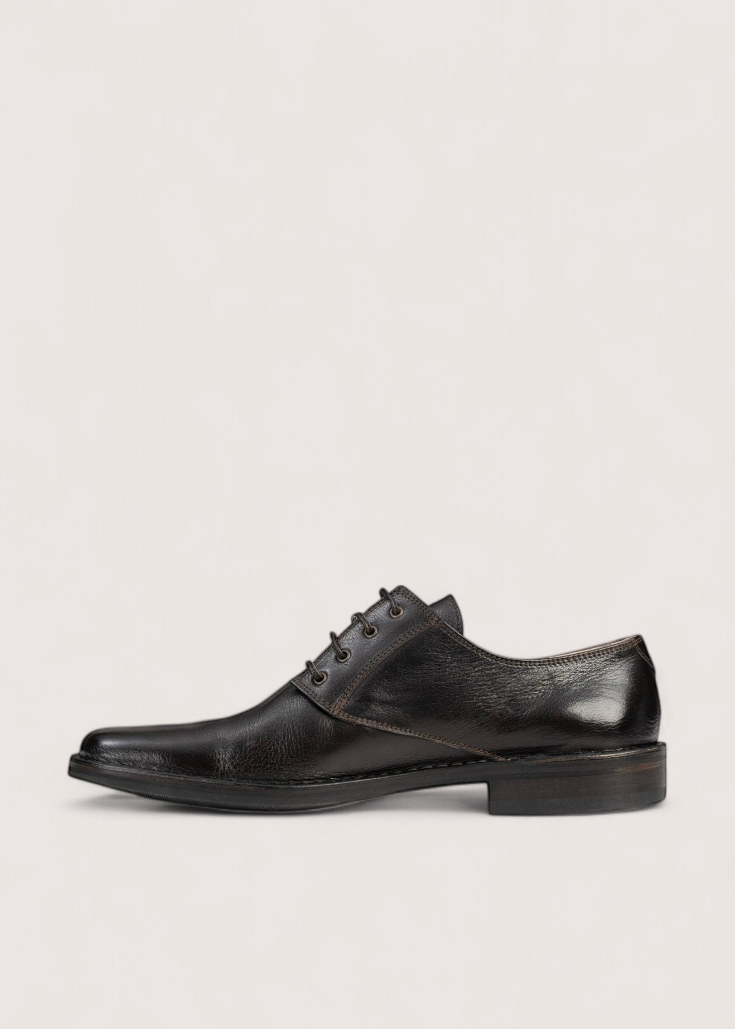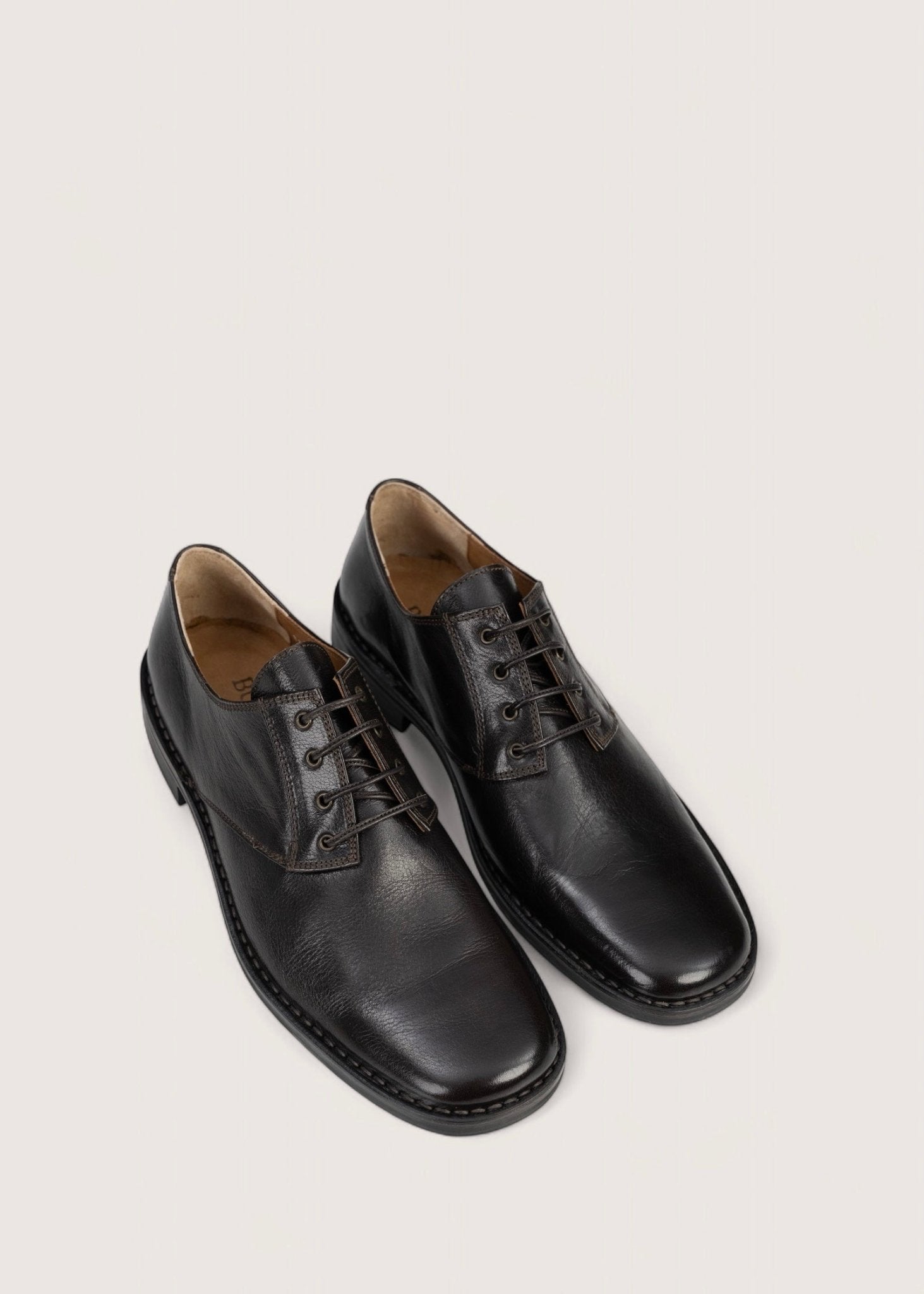 Klassisk herre snøresko i mørk brun skind med rund snude, lav tå og tre snørehuller. Lavet på skindsål betrukket med slidstærkt gummi.