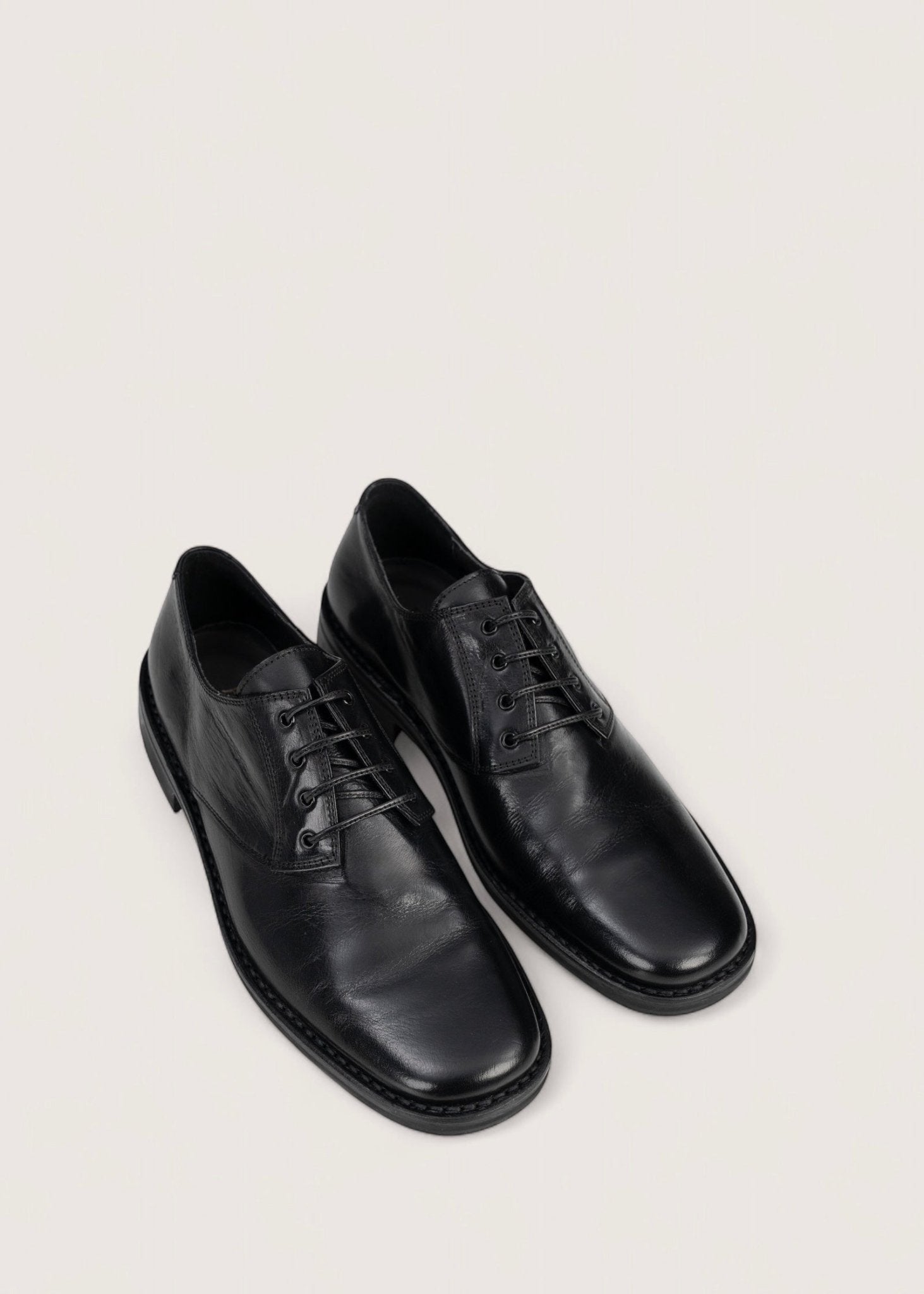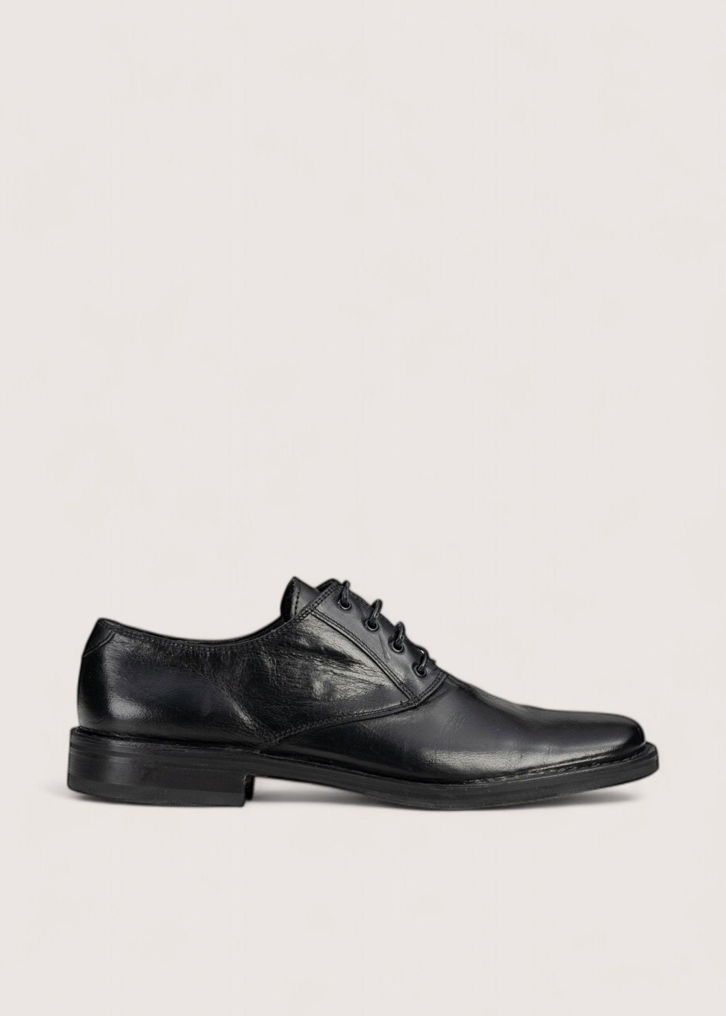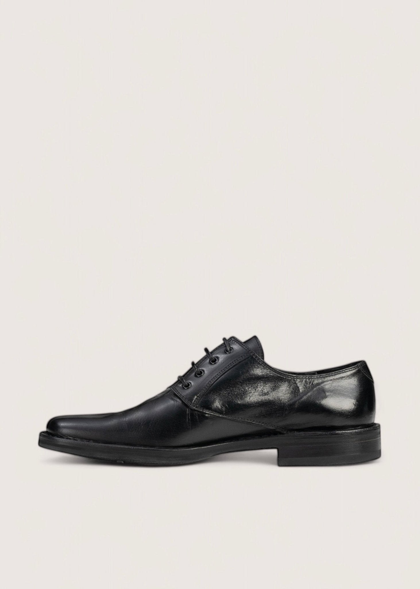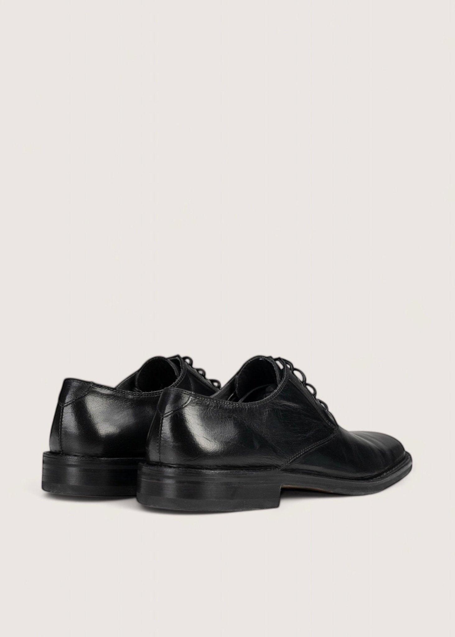 Klassisk herre snøresko i sort skind med rund snude, lav tå og tre snørehuller. Lavet på skindsål betrukket med slidstærkt gummi.