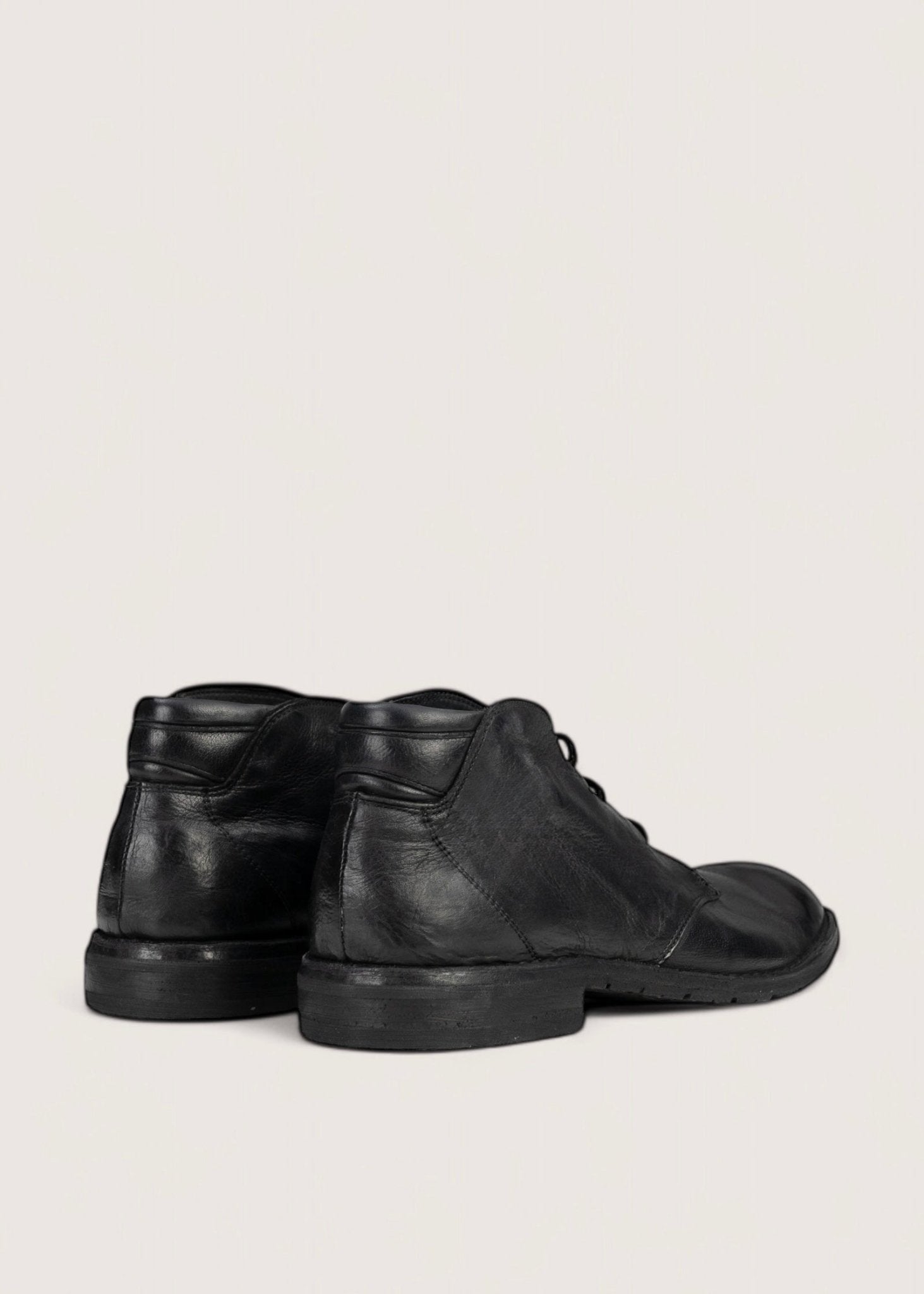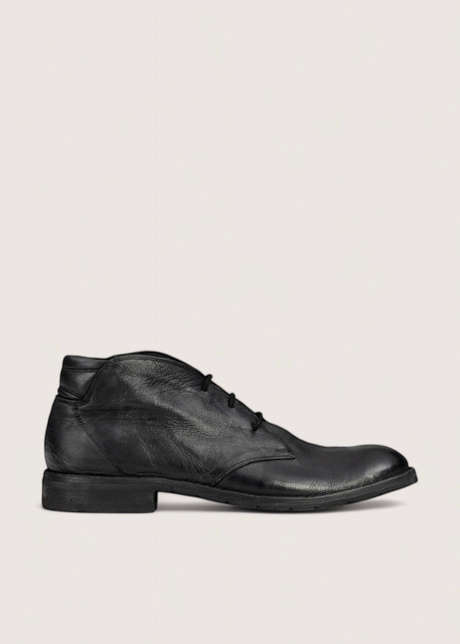 Kort herre snørestøvle i vasket, sort skind. Støvlen har rund snude, tre snørehuller samt ruskindssnøre og skindsål betrukket med slidstærkt gummi. Skindets rå og patinerede look opnås gennem en helt speciel vaskeproces.